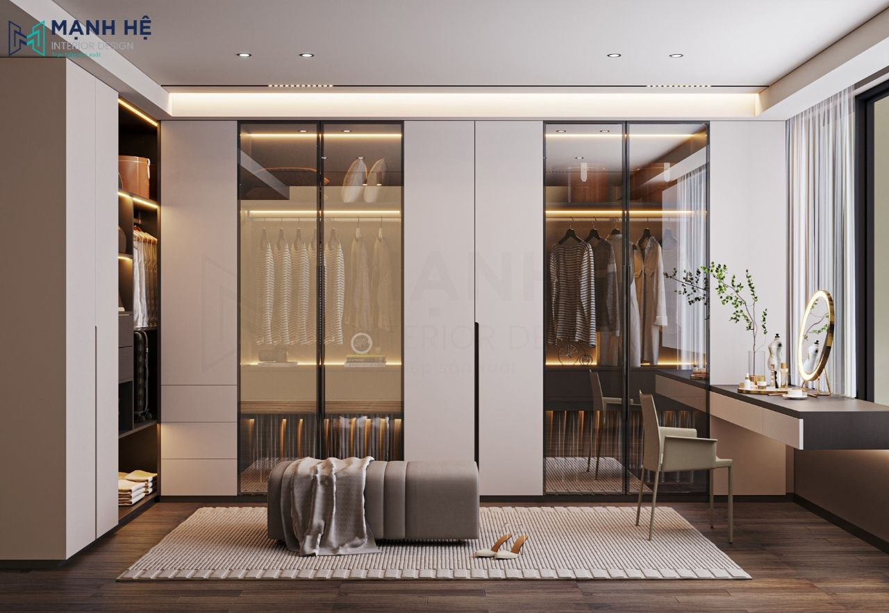 Phòng thay đồ được trang bị hệ tủ quần áo cao đụng trần được làm từ chất liệu gỗ công nghiệp MDF chống ẩm mốc và kết hợp thêm cánh kính, gắn led bên trong để gia chủ thuận tiện cho việc lựa chọn trang phục khi ra ngoài.