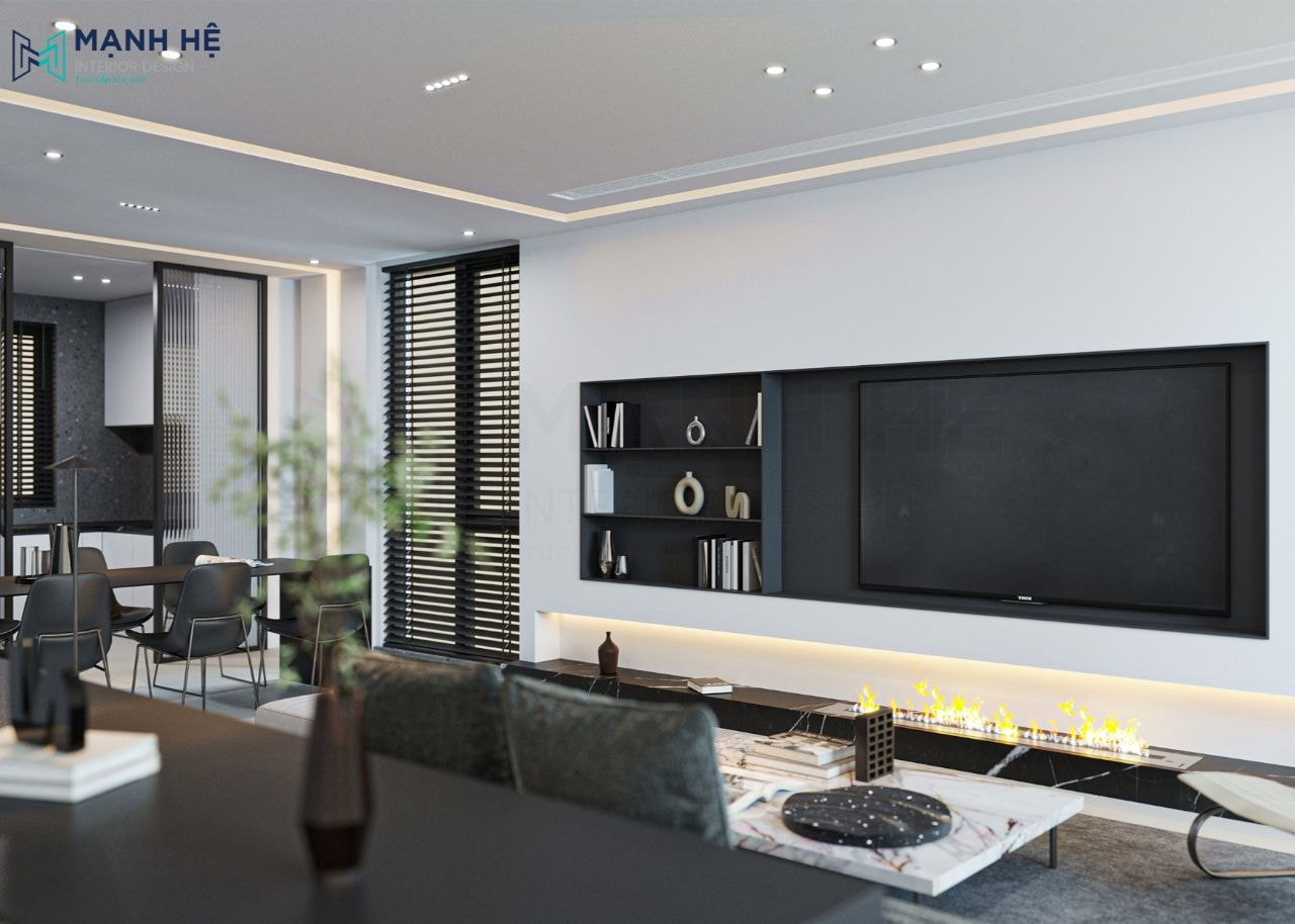 Bố trí phòng khách liên thông phòng bếp để tối ưu diện tích căn hộ. Nội thất chung cư sử dụng chất liệu gỗ công nghiệp MDF cao cấp giúp chống mối mọt, bền bỉ với thời gian. Bộ ghế sofa và bàn trà được đặt ngay ở chính giữa phòng khách kèm theo thảm lót tinh tế. Đặc biệt kệ tivi được thiết kế âm tường, kết hợp hợp thêm các ngăn hộc đựng đồ trang trí.