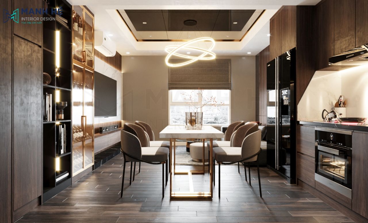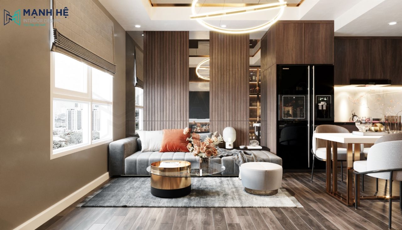 Thiết kế phòng khách liền bếp sang trọng với tone màu gỗ trầm sang trọng