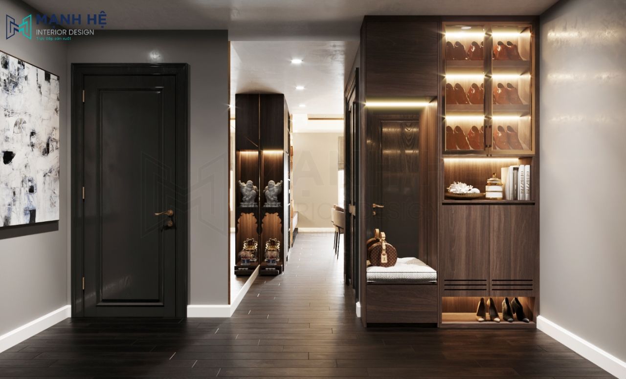 Tại lỗi cửa ra vào được thiết kế tủ giày cùng tone với nhà, cao đụng trần tối ưu không gian lưu trữ. Với cửa tủ kính chạy chỉ vàng tạo sự sang trọng cho góc cửa khi bước vào. Giữa tủ và chân tủ có chừa kệ giúp khách hàng dễ dàng hơn trong việc sử dụng và đặt đồ trước và sau khi ra ngoài.