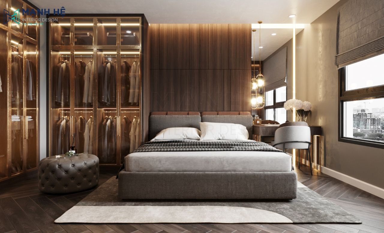 Với sự tiện nghi và sang trọng của phòng khách liền bếp thì nội thất phòng ngủ cũng được KTS Mạnh Hệ đặt nhiều tâm huyết để trau chuốt tỉ mỉ các đường thiết kế dựa trên những mong muốn của khách hàng.