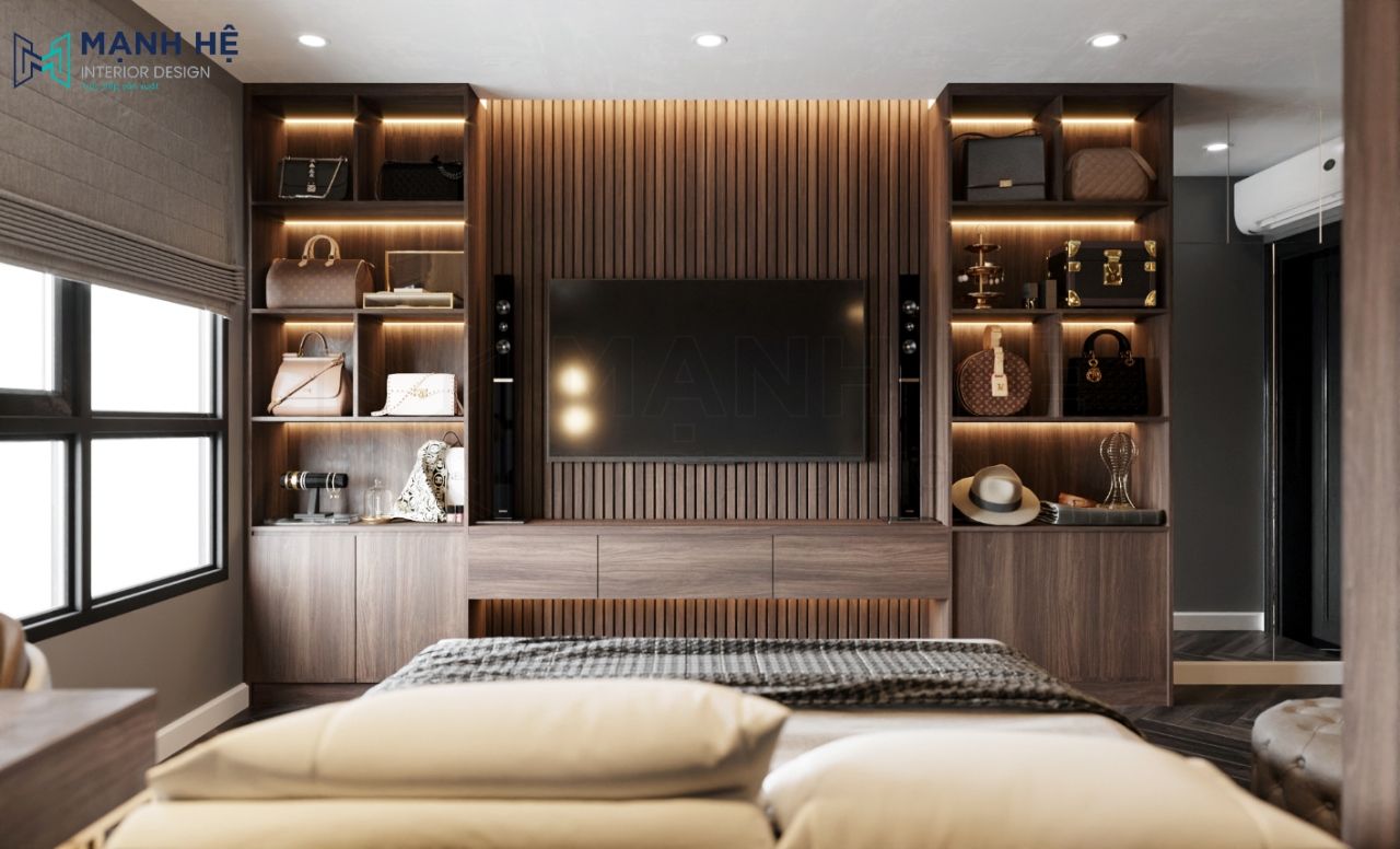 Hệ tủ tivi và tủ trang trí tích hợp tủ lưu trữ phía dưới, được thiết kế treo tưởng thành 1 khối vô cùng bắt mắt giúp gia chủ trưng bày túi xách hay những vật dụng cần thiết. Tường phía sau được ốp vách lam gỗ vô cùng sang trọng, nhưng vẫn giữ được sự ấm cúng cho gian phòng ngủ.