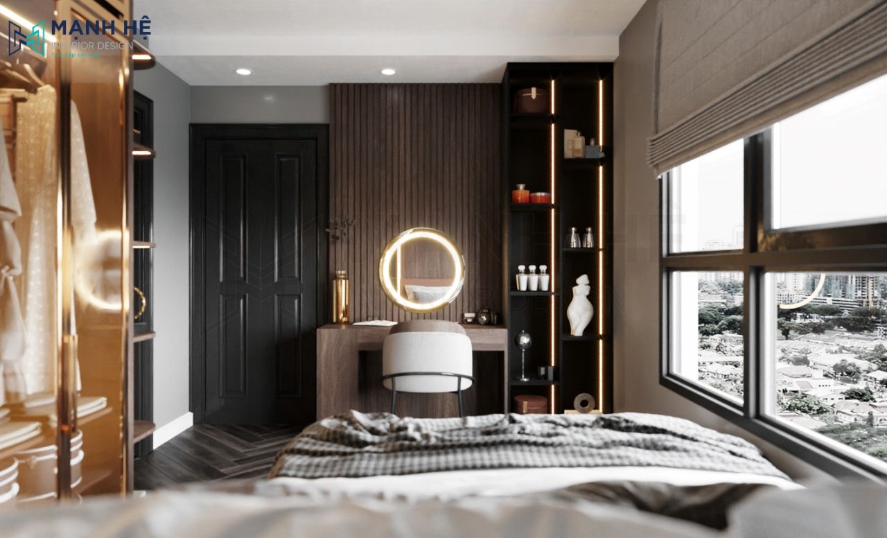 Giường ngủ lớn kết hợp với thảm trải sàn bằng nhung tạo thành khối với tone xám vô cùng sang trọng. Tích hợp bàn trang điểm treo tường giúp gia chủ nữ dễ dàng sử dụng rất gọn gàng. Phối kèm theo đó là chiếc đèn chùm thả dáng dài tăng thêm ánh sáng cho bàn trang điểm và tạo thêm điểm nhấn cho căn phòng.