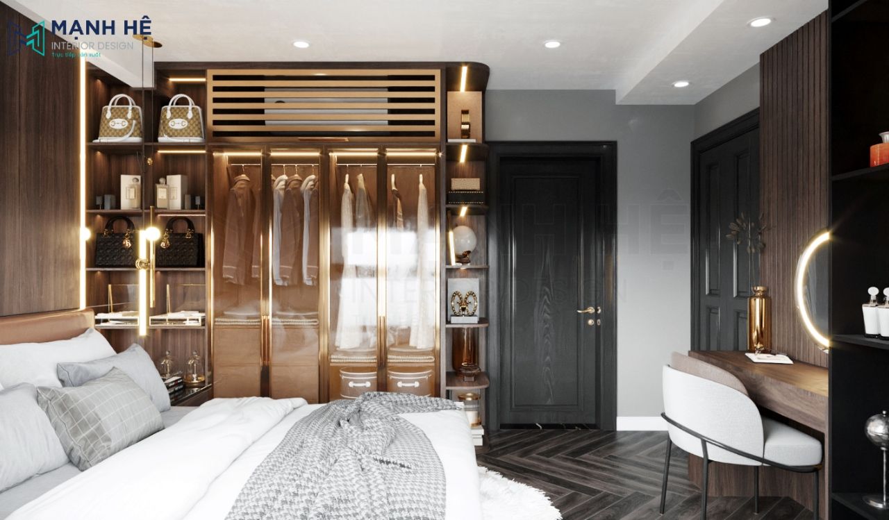 Tổng quan phòng ngủ Master được thiết kế ốp gỗ công nghiệp toàn bộ tạo sự thống nhất cho căn phòng. Với tủ quần áo cánh kính chạy chỉ vàng, đi đèn led âm tủ sang trọng. Kết hợp với kệ trang trí phía cửa đi vào giúp gia chủ decor theo ý thích hoặc lưu trữ vật dụng khi cần thiết.