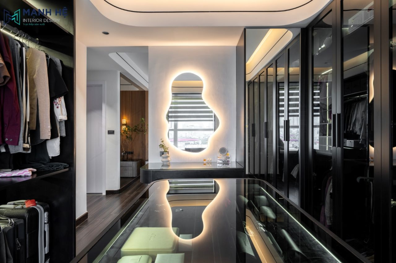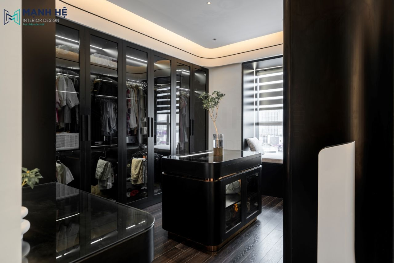 Thi công hoàn thiện nội thất phòng thay đồ cho chủ nhân căn nhà đúng như mong đợi, toàn bộ hệ tủ áo cánh kính màu đen đã toát lên được sự sang trọng, thuận tiện cho gia chủ trong qua trình lựa chọn trang phục.