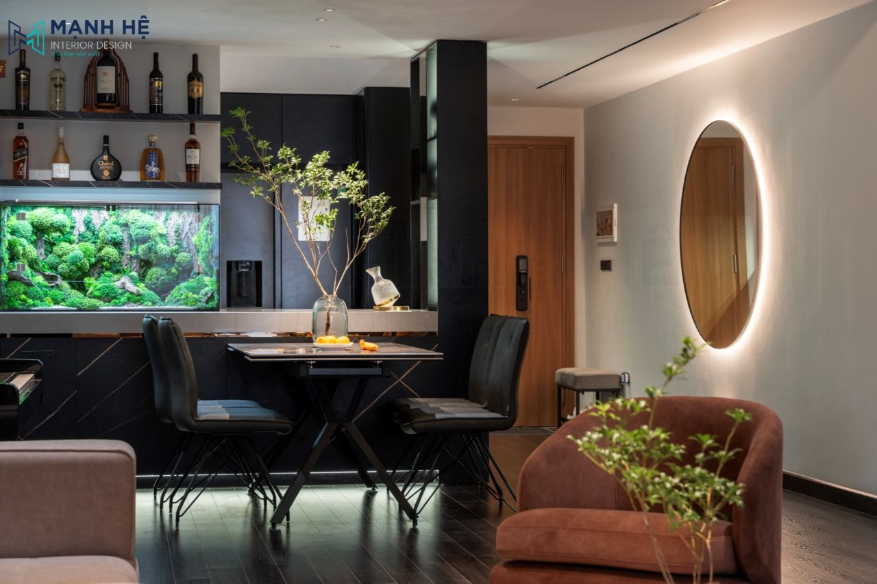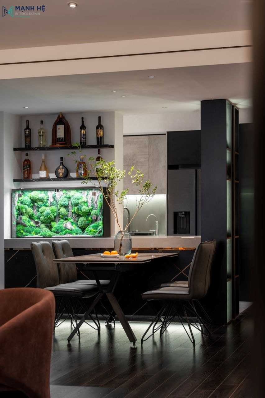 Thi công nội thất phòng bếp nối liền phòng khách với bàn ăn đặt chính giữa làm vật ngăn cách, kệ rượu treo tường với bể cá bên dưới khiến phòng bếp thêm sinh động hơn nhiều.