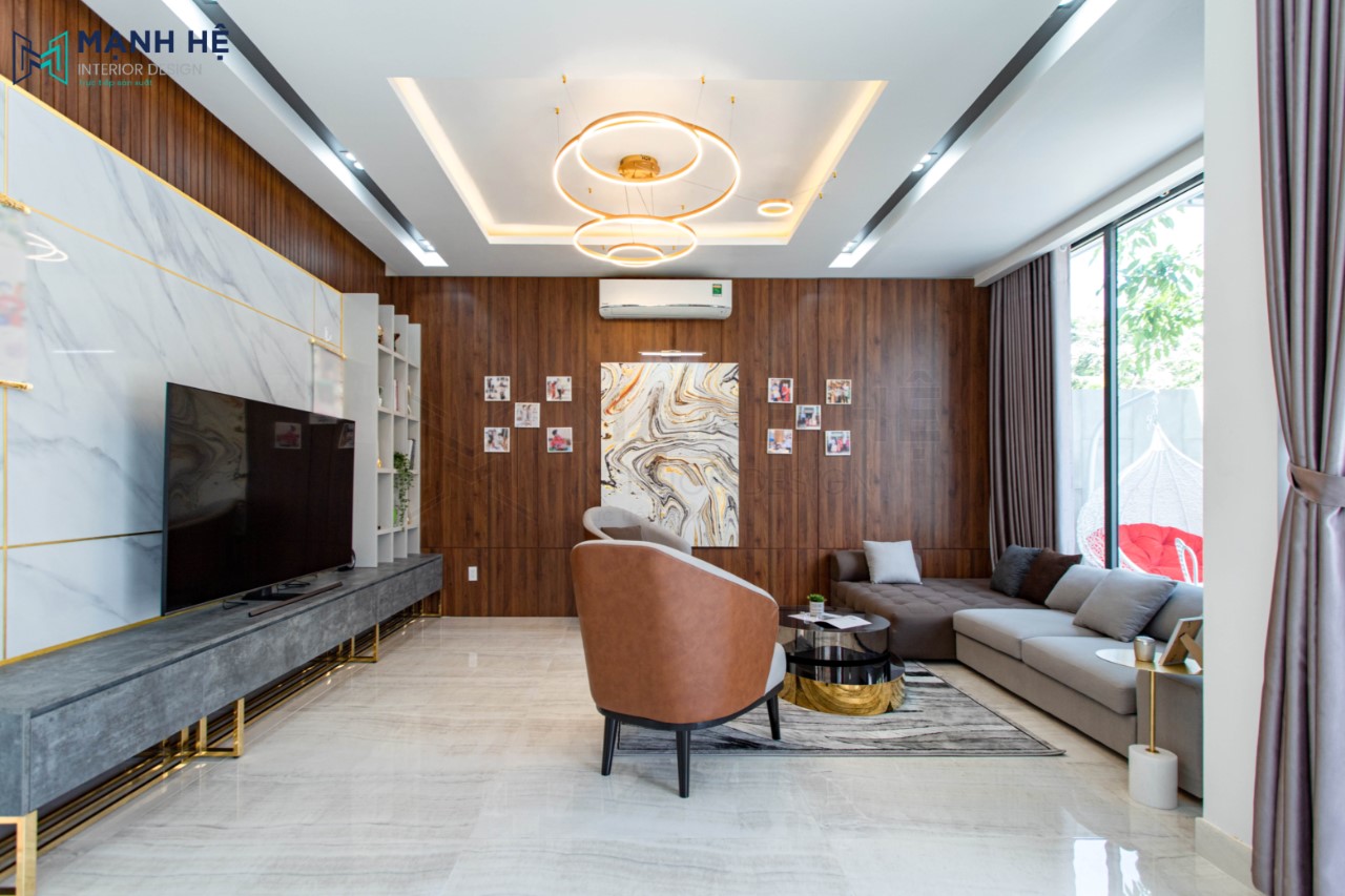 Nội thất phòng khách với thiết kế tối giản nhưng điểm nhấn nằm ở vách lam gỗ ốp tường rất sang trọng. Ốp tường đá vân mây tự nhiên kết hợp đường ron vàng rực rỡ sau tivi. Kệ tivi màu xám mới lạ với khung sắt vàng chắc chắn. Đèn trần thả thiết kế bắt mắt kết hợp đèn led âm trần giúp phòng khách thêm sáng sủa.