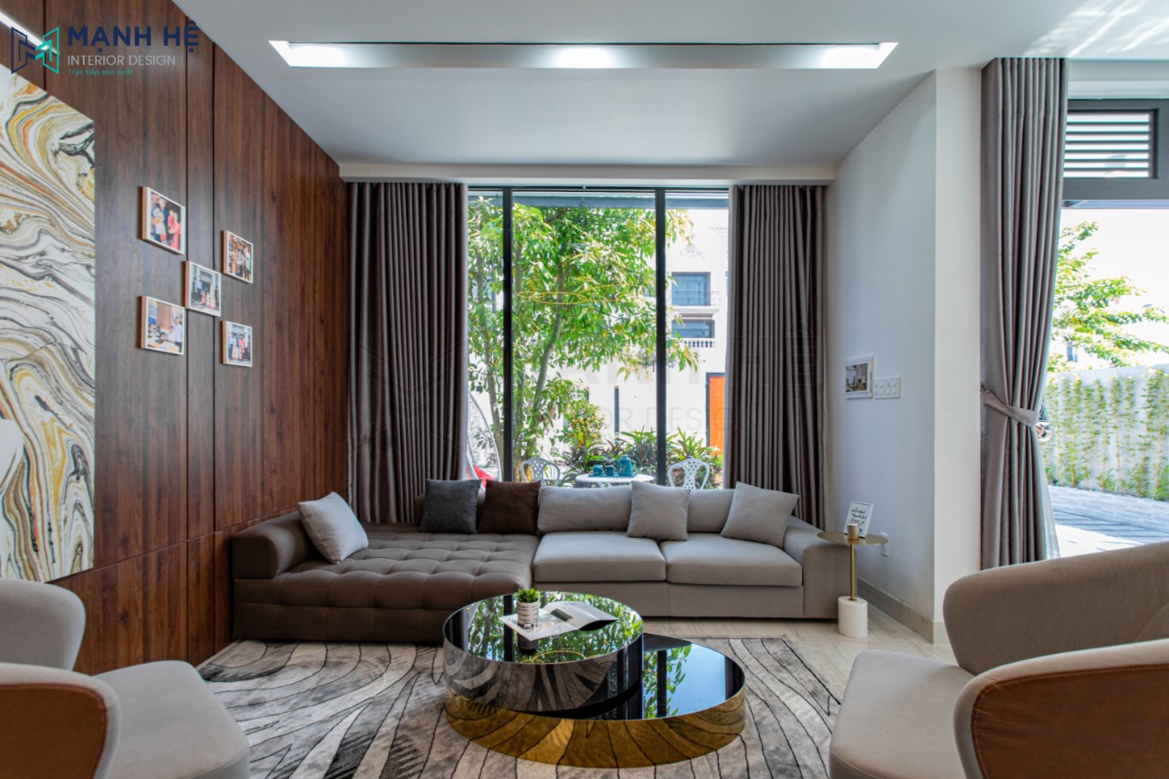 Thông với khu vui chơi của các bé qua cửa kính là khu vực sinh hoạt, nói chuyện giữa các thành viên trong gia đình với bộ ghế sofa chữ I và bàn trà. Ốp tường gỗ sang trọng. Hệ cửa kính giúp không gian thêm thoáng đãng hơn.