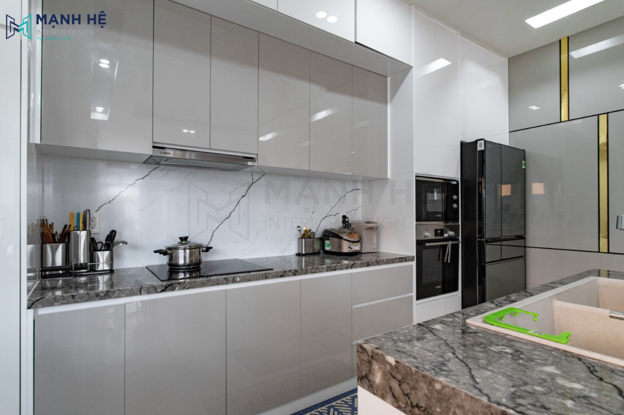 Thi công nội thất phòng bếp tiện nghi, hiện đại với hệ tủ bếp gỗ acrylic màu xám cao cấp và tinh tế