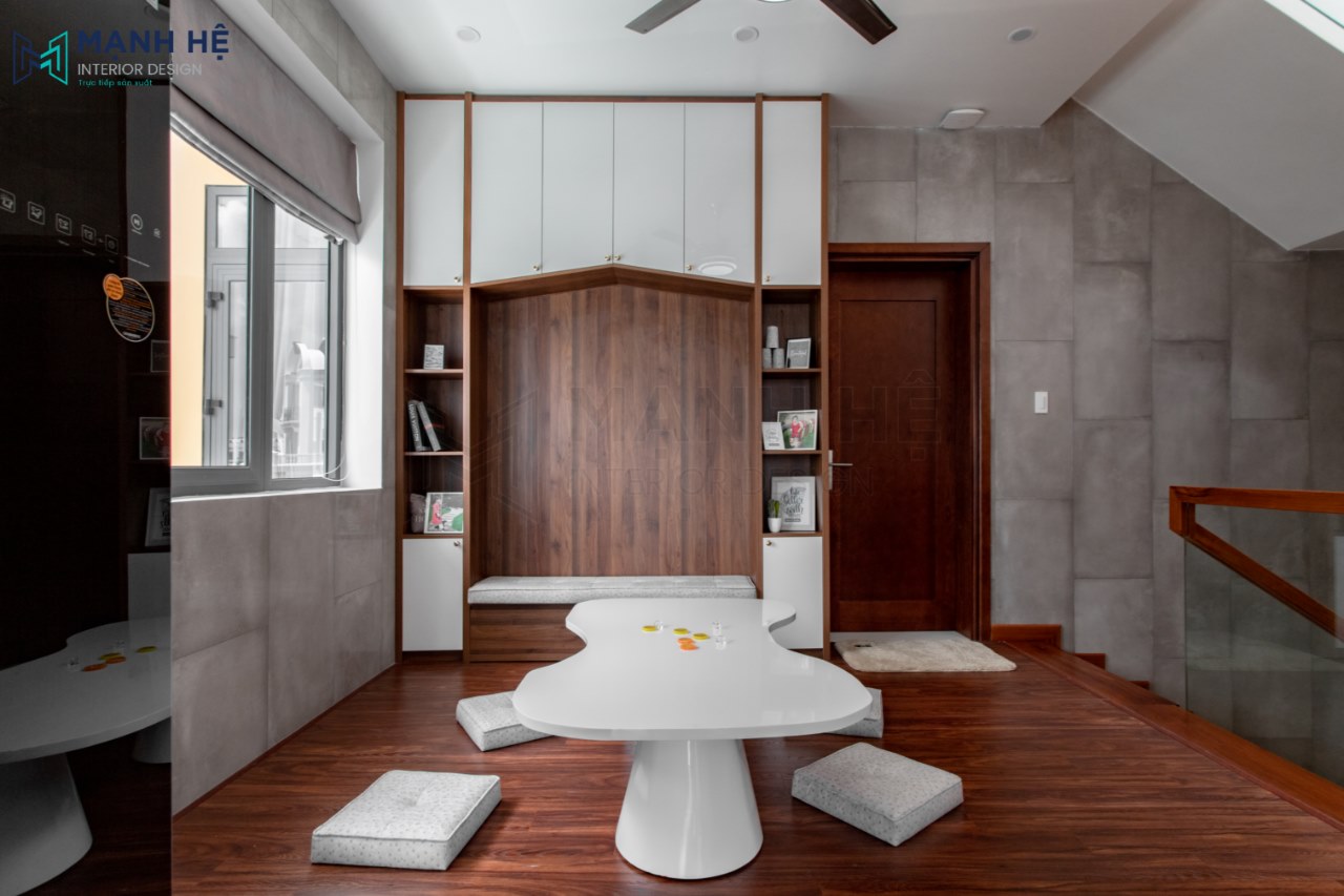 Phòng sinh hoạt chung là nơi các thành viên trong gia đình quầy quần và tụ họp lại với nhau mỗi khi rãnh rỗi. Với nội thất gồm tủ trang trí cao đụng trần, tích hợp thêm ghế sofa chữ I nhỏ. Bố trí bộ bàn trà với thiết kế độc lạ và đệm ngồi lót. Đây có thể làm nơi cho các bé chơi đùa.
