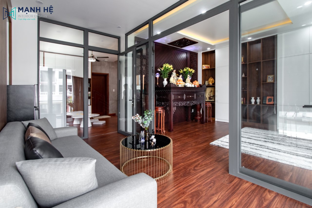 Phòng thờ trang nghiêm với bàn thờ được làm từ gỗ tự nhiên với các đường nét thiết kế hài hòa và được cân nhắc các yếu tố tâm linh và văn hóa người Việt.