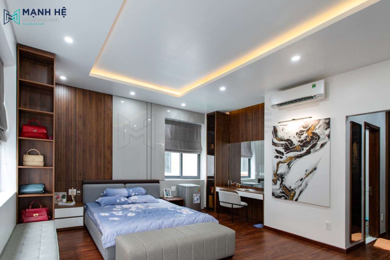 Phòng ngủ master hiện đại với ốp tường gỗ công nghiệp phủ acrylic sáng bóng và melamine màu nâu đậm. Nội thất cơ bản gồm tủ trang trí, giường ngủ, bàn trang điểm, kệ túi xách và mỹ phẩm, kệ tivi.