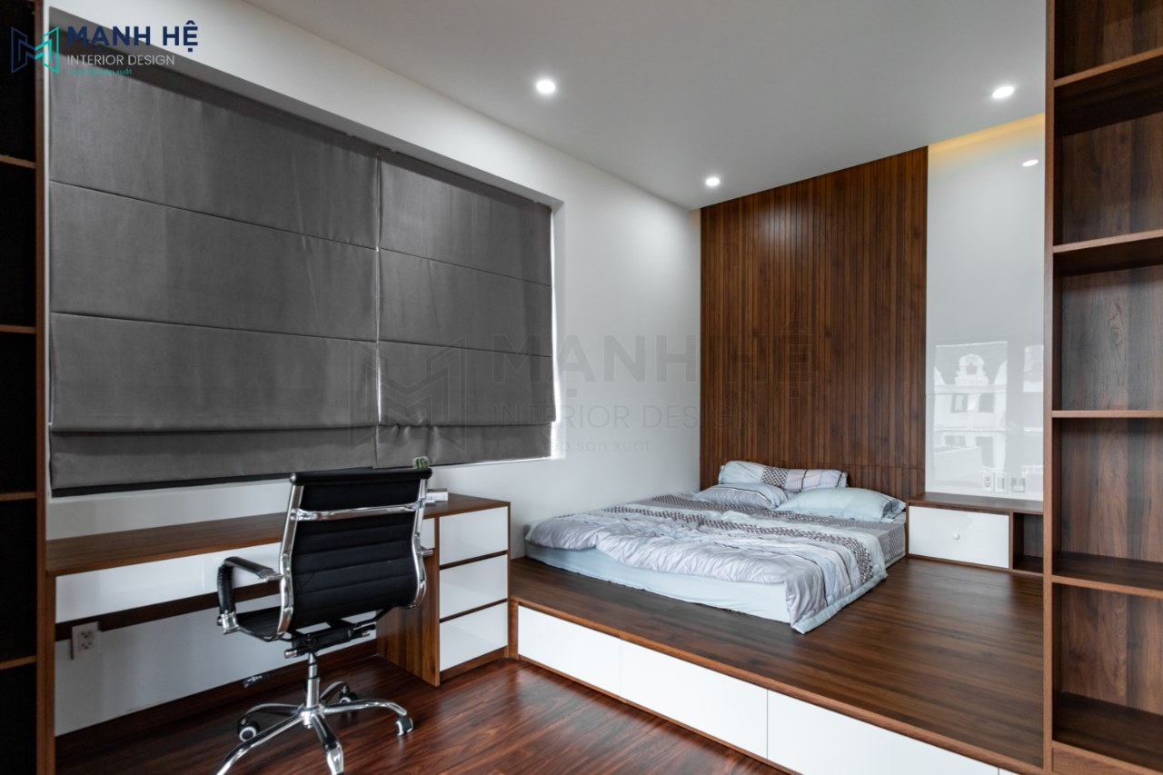 Nội thất phòng ngủ này có vẻ đơn giản hơn khi sử dụng bục giường ngủ gỗ công nghiệp tích hợp thêm tủ quần áo rất thông minh giúp tối ưu được diện tích. Tab đầu giường với vách lam gỗ ốp tường và thêm kệ trang trí. Bàn làm việc đặt cạnh cửa sổ.