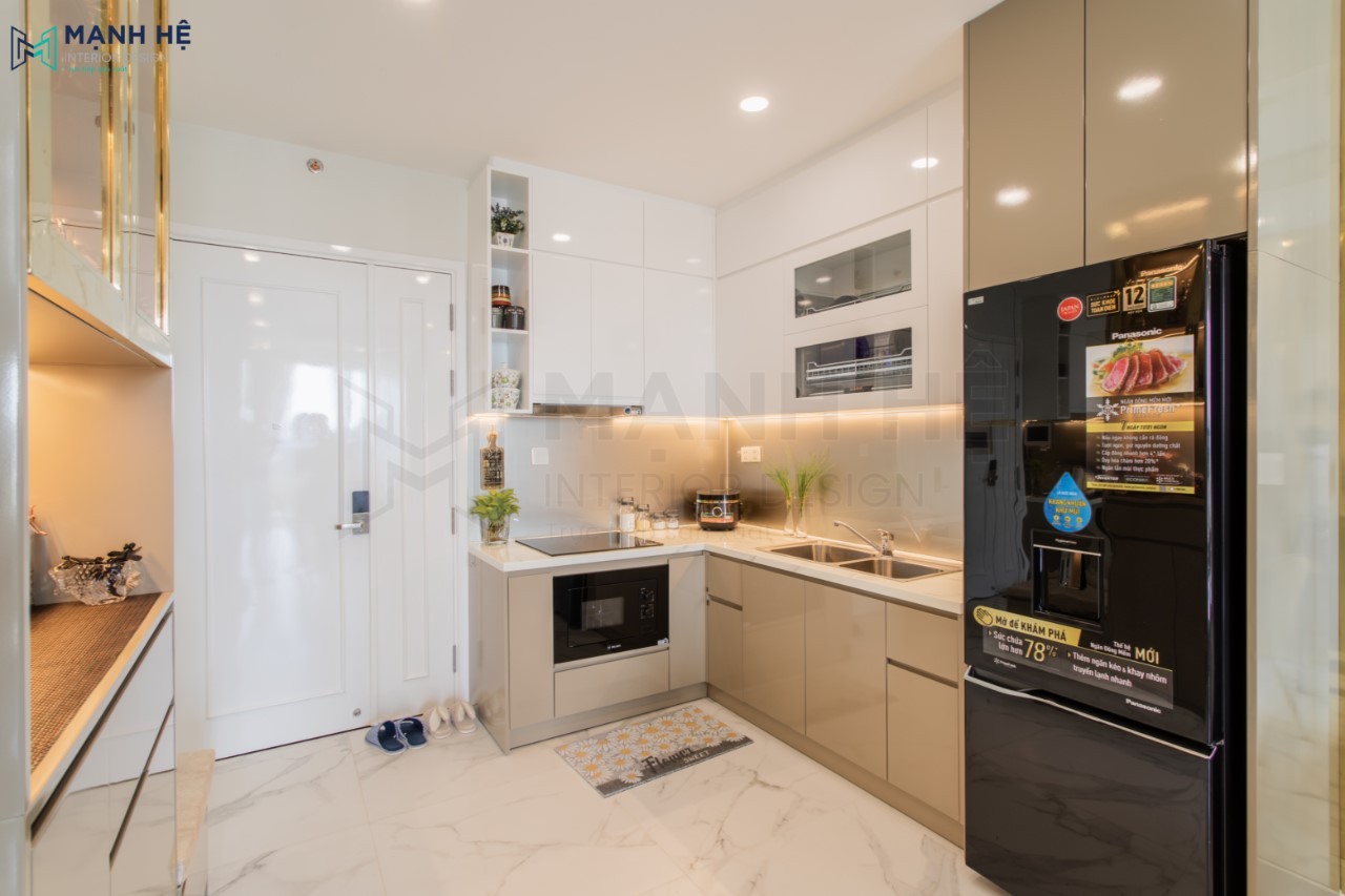 Thi công hệ tủ bếp đụng trần bằng gỗ công nghiệp sơn giúp tối ưu diện tích căn hộ 65m2