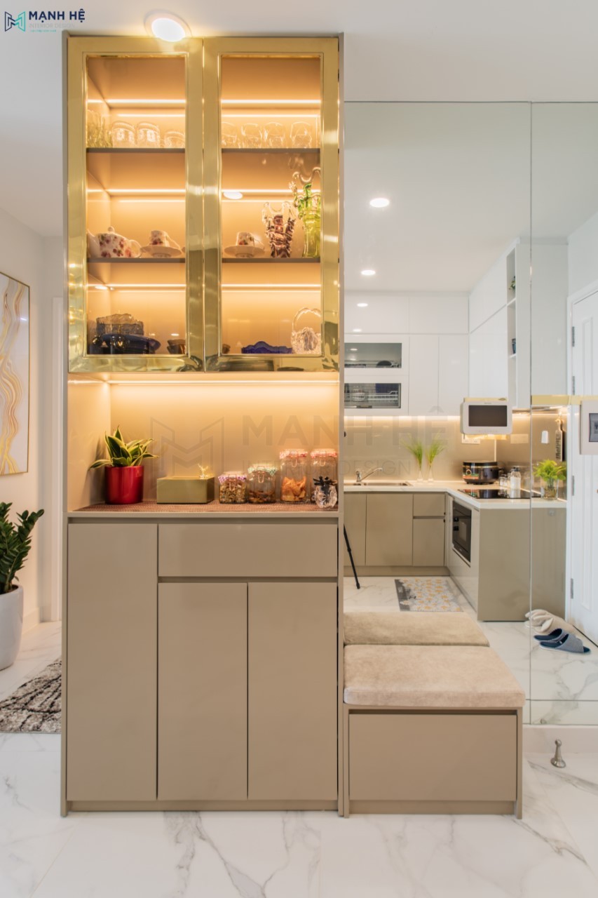 Hệ tủ kệ trang trí đụng trần cực kỳ cuốn hút với ý tưởng viền cánh tủ kim loại mạ vàng và sử dụng hệ đèn led bên trong tủ để tôn lên vẻ đẹp của những món đồ gia chủ trưng bày.