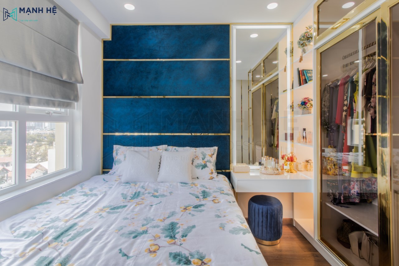 Thi công phòng ngủ master sang trọng, tiện nghi với màu trắng tinh khôi là gam màu chủ đạo, kết hợp cùng nội thất được làm từ gỗ và kính cao cấp thể hiện được đẳng cấp của Gia chủ. Bố trí giường ngủ sát tường giúp tiết kiệm diện tích cho căn phòng. Ốp nệm vách tường đầu giường màu xanh dương kết hợp cùng những đường chỉ vàng nhằm tạo điểm nhấn cho tổng thể.