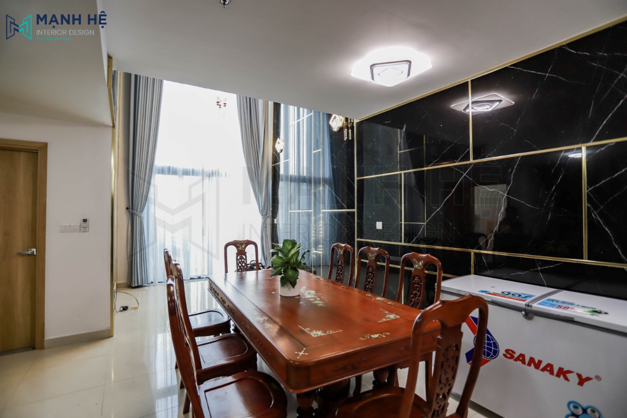 Không gian phòng khách bếp được ốp đá vân mây màu đen sang trọng, dán chỉ vàng nổi bật