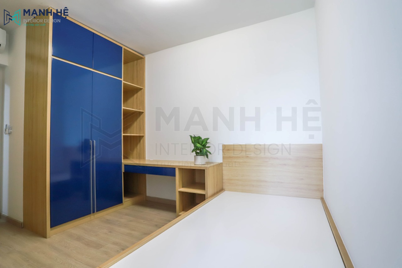 Căn phòng ngủ master được thi công theo kiểu đơn giản, nhẹ nhàng, tập trung chủ yếu vào công năng sử dụng. Tâm điểm của phòng ngủ master vẫn là chiếc giường gỗ công nghiệp hiện đại. Từng đường nét được thiết kế tối giản nhằm mang đến cho căn phòng nét đẹp tự nhiên vốn có của nó. Gam màu xanh – nâu gỗ là sự kết hợp hoàn hảo cho không gian này. Sự kết hợp mới mẻ này đã đem đến cho căn phòng một màu sắc hiện đại và tươi mới.