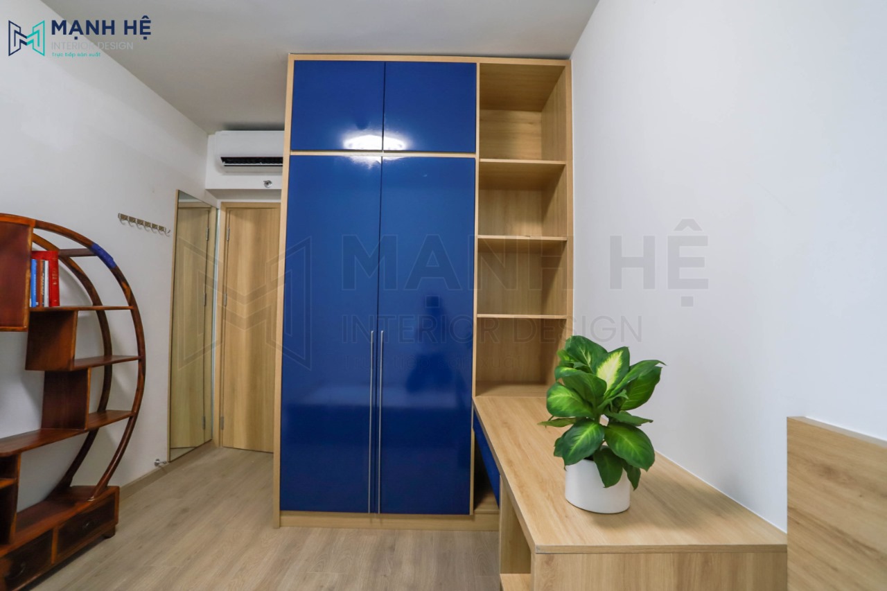 Tủ quần áo màu xanh coban nổi bật, làm điểm nhấn cho cả căn phòng master