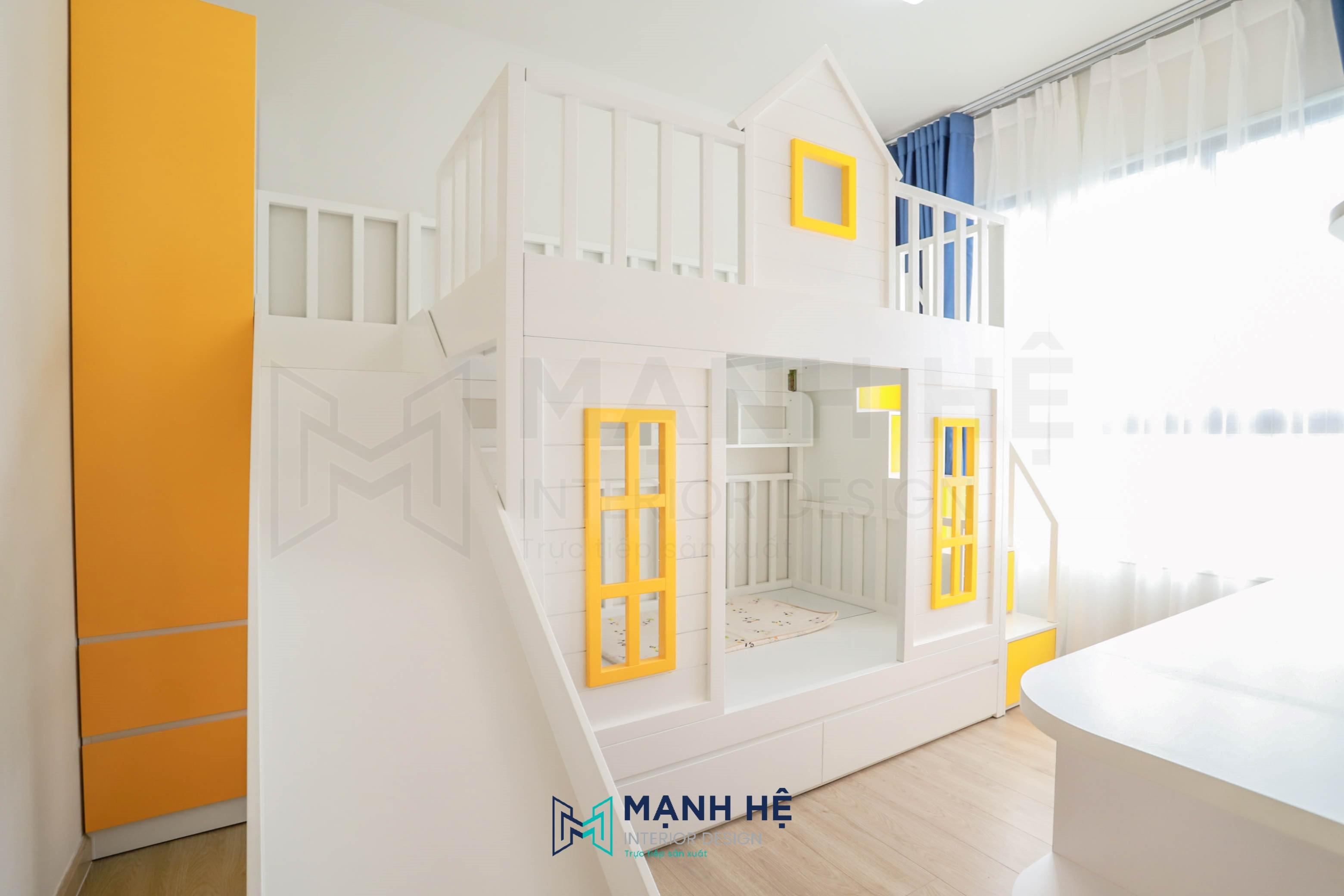 Với diện tích nhỏ hơn so với các phòng ngủ khác, nên phòng ngủ cho bé được thiết kế chiếc giường tầng hình ngôi nhà sinh động được làm hoàn toàn từ gỗ lõi xanh MDF An Cường có độ bền chắc chắn và an toàn nhất cho bé.