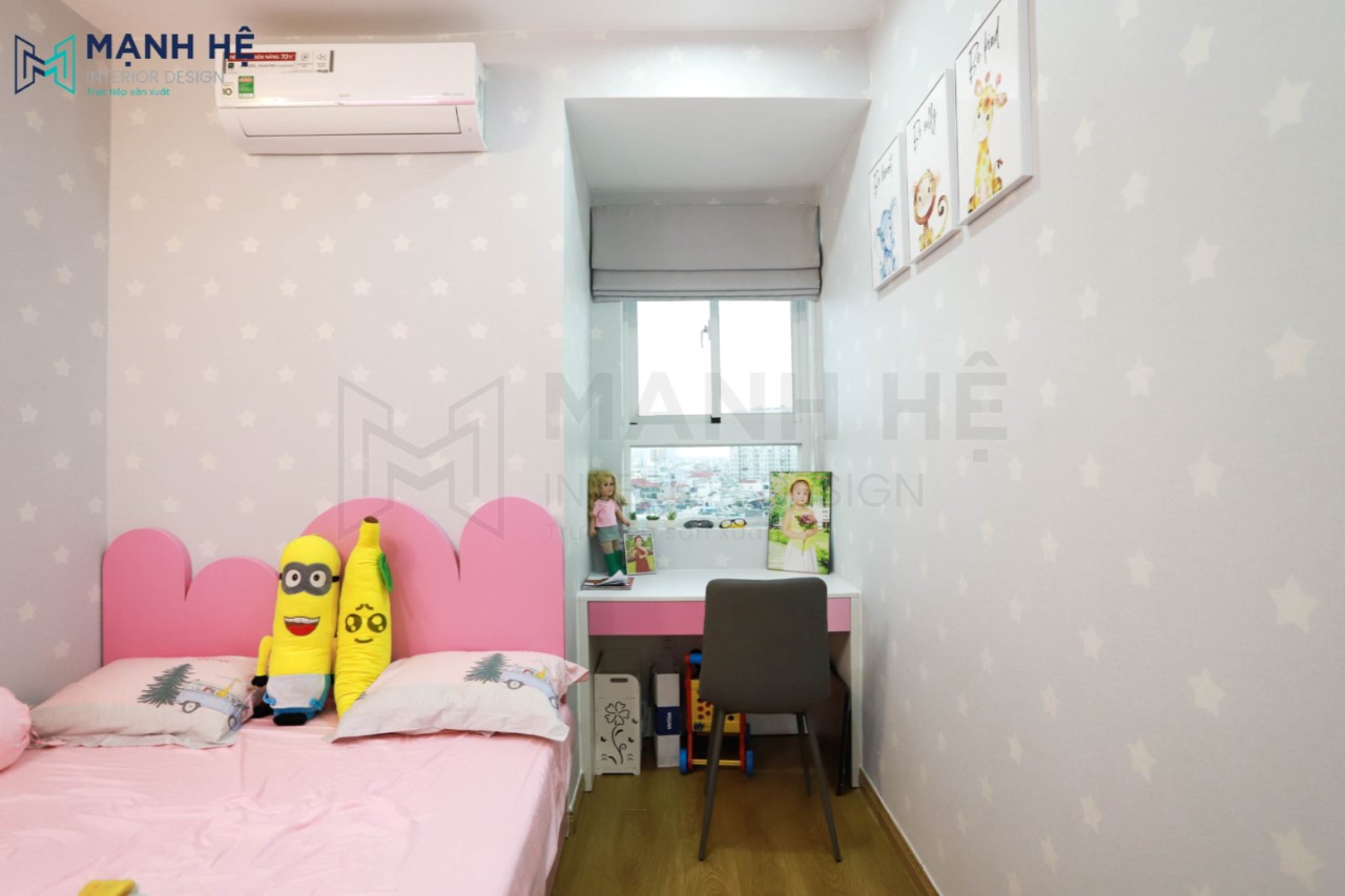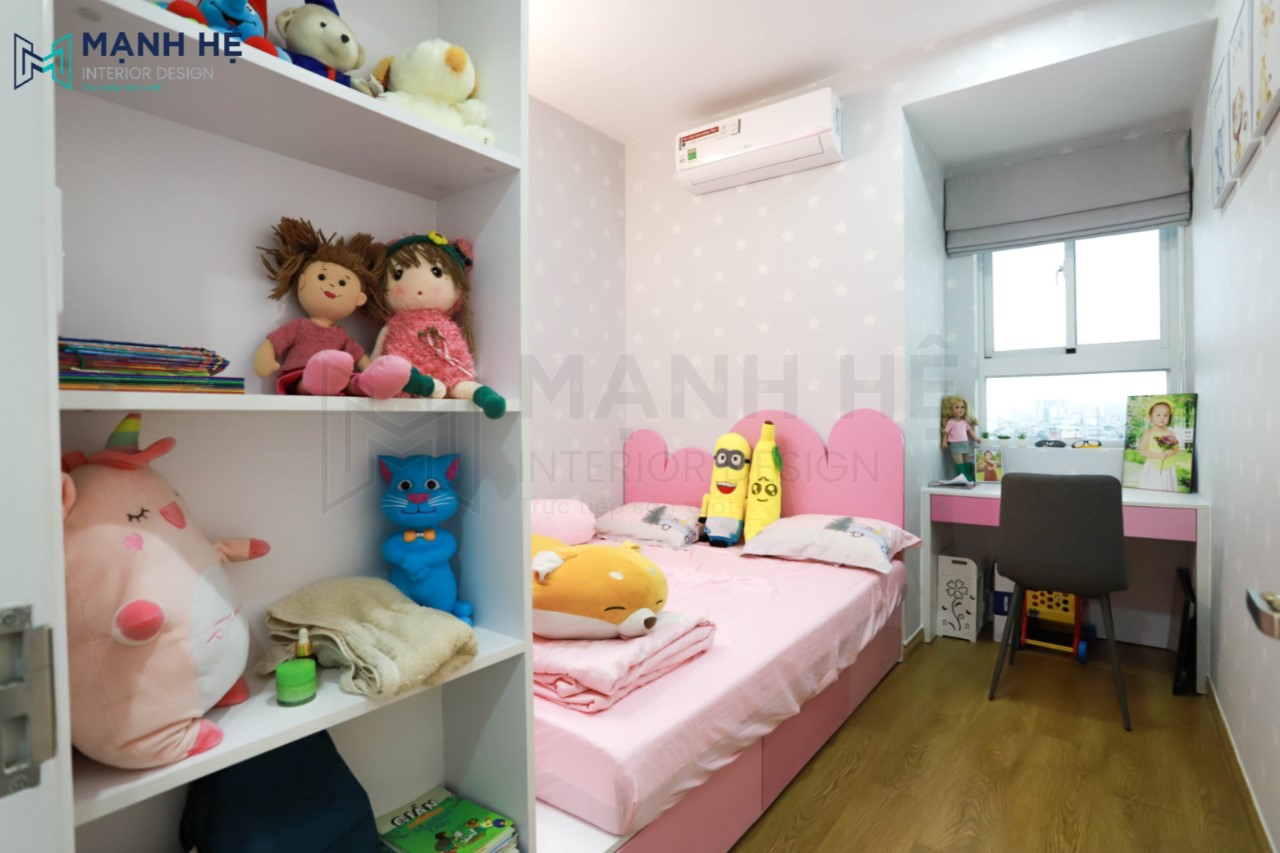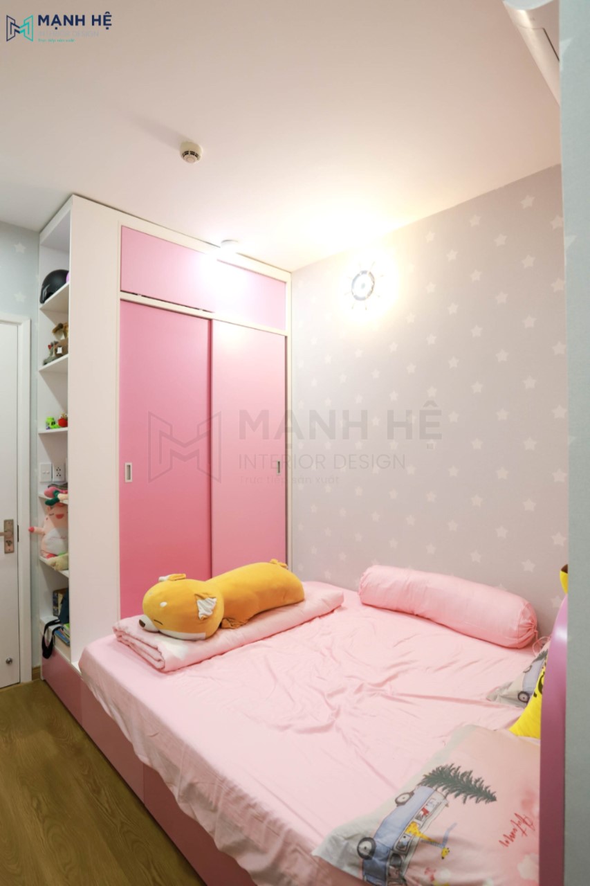 Thi công phòng ngủ cho bé gái với màu hồng ngọt ngào là gam màu chủ đạo. Sử dụng giấy dán tường với hình ảnh ngộ nghĩnh giúp kích thích tính tò mò, sáng tạo cho bé.