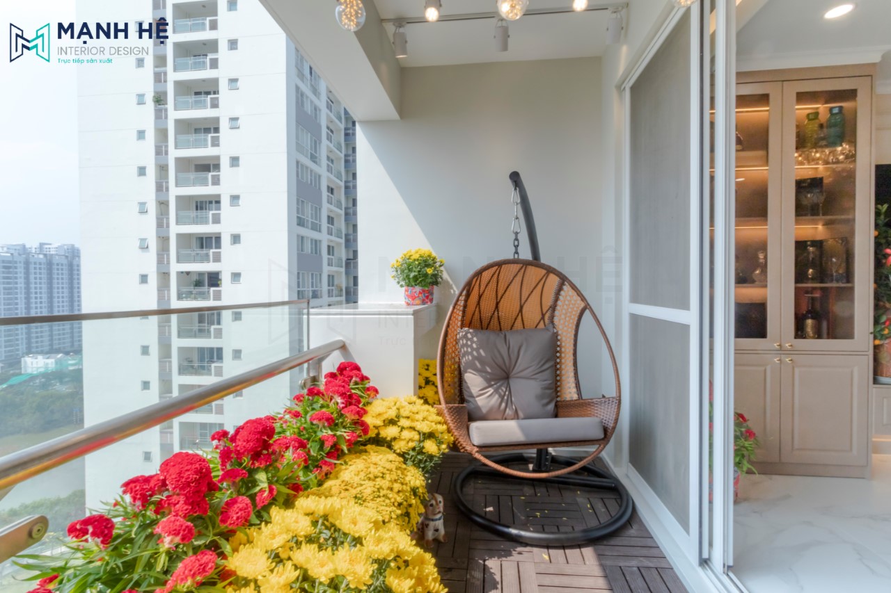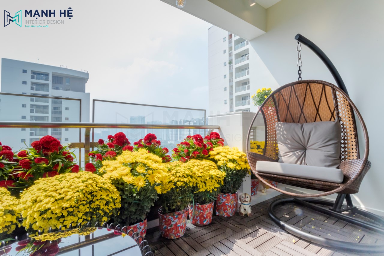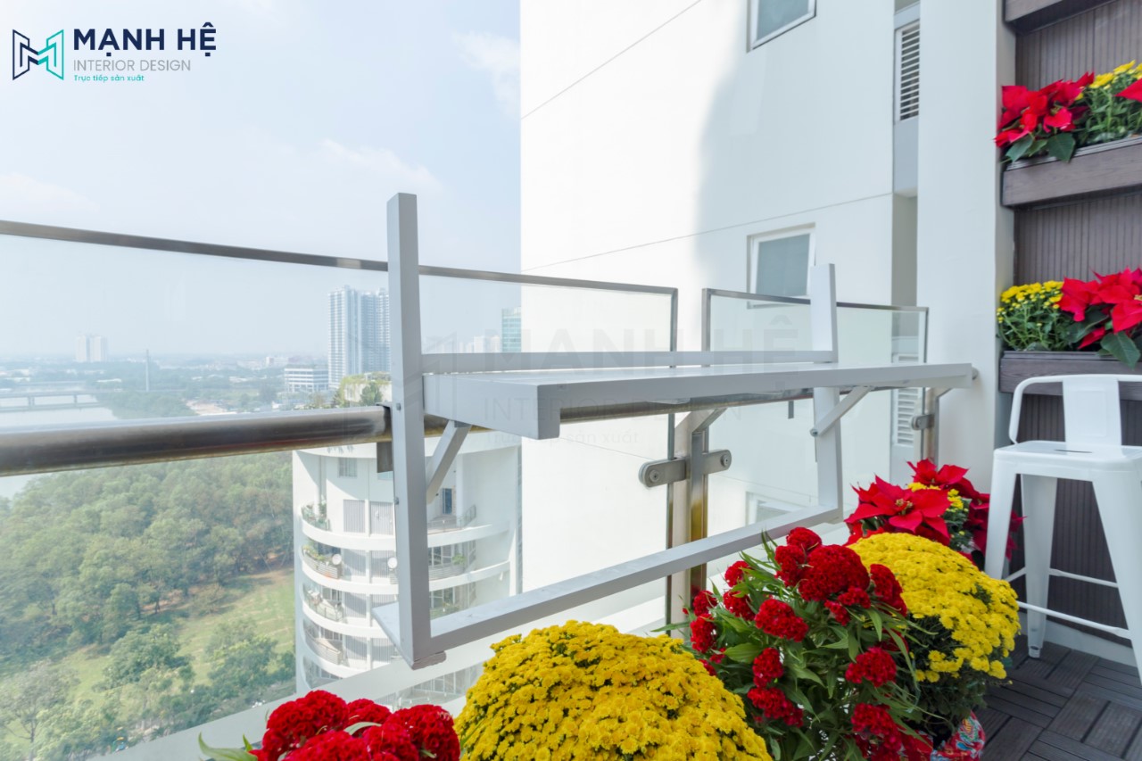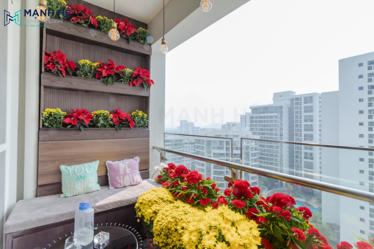 Ưu điểm của căn hộ là có được 1 ban công thoáng mát, rộng rãi, do vậy gia chủ tận dụng đây làm nơi để thư giãn với các chậu hoa tươi và bàn trà. Thiết kế thêm kệ gỗ ốp tường để trang trí hoa tươi.