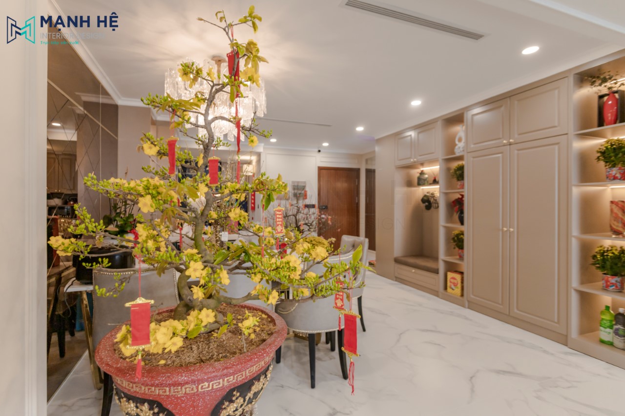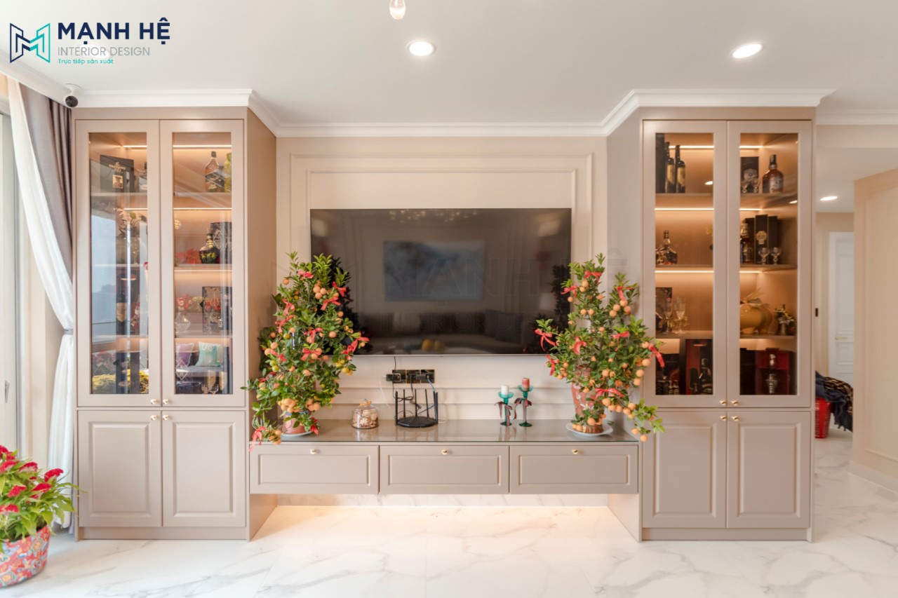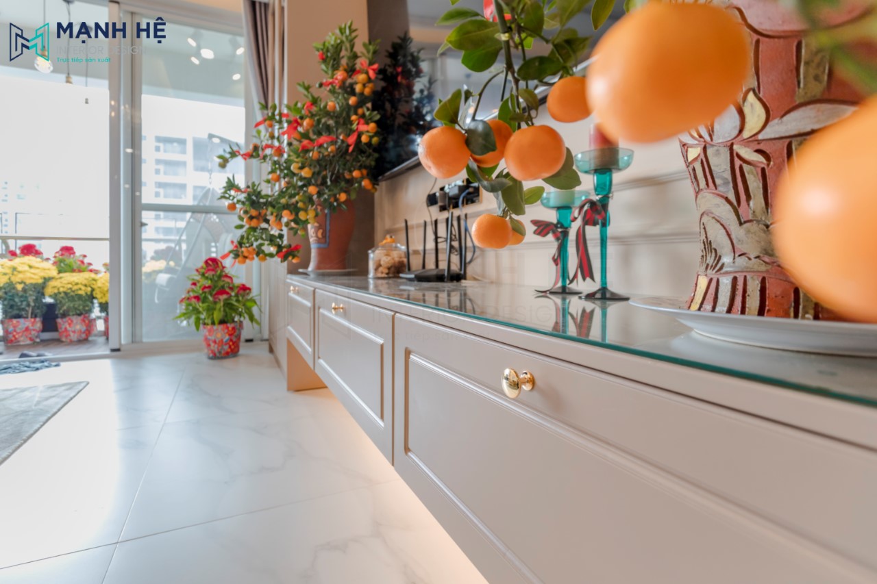 Hệ tủ tivi chữ U với sự kết hợp 2 chất liệu cửa kính và gỗ tự nhiên màu trắng, cùng hệ thống đèn led trong. Mạnh Hệ đến thăm nhà quý khách hàng dịp Tết đến Xuân về nên có sự xuất hiện của chậu quất và hoa mai tạo không khí ấm cúng và rộn ràng.