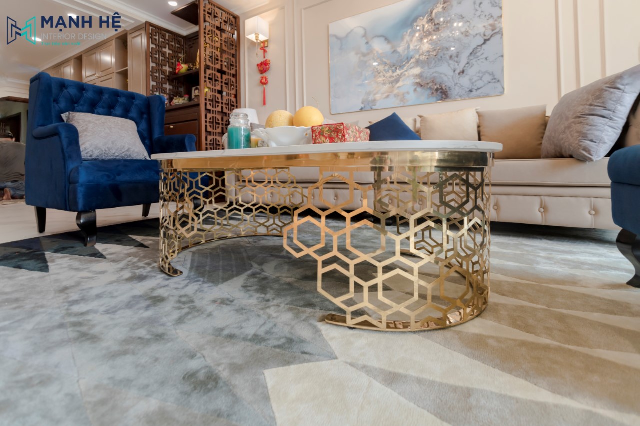 Bàn trà mặt đá sang trọng đặt giữa bộ bàn ghế sofa