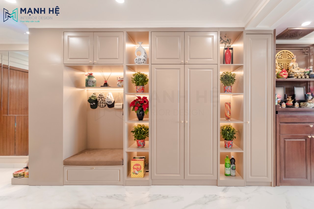 Tủ trang trí kết hợp tủ giày được bố trí dọc theo không gian tường trống đẹp, tiện nghi