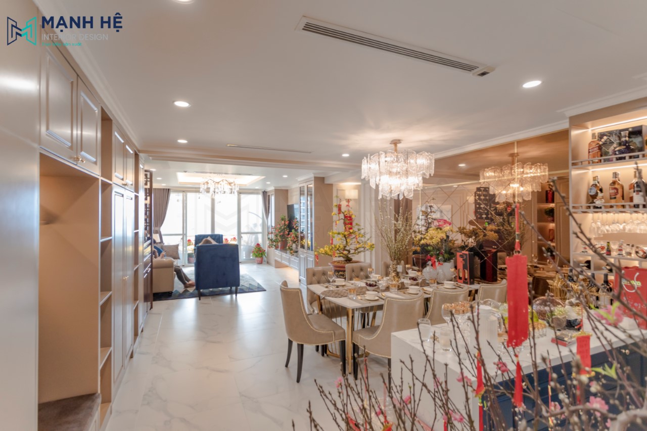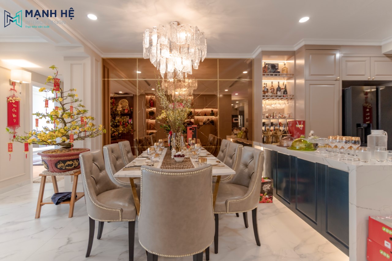 Phòng bếp được thiết kế cạnh phòng khách như một giải pháp để tối ưu diện tích căn hộ. Đèn pha lê giúp đem lại vẻ đẹp lấp lánh, sang trọng cho căn nhà. Bộ bàn ăn sang trọng, quý phái giúp tăng tính thẩm mỹ cho phòng bếp.