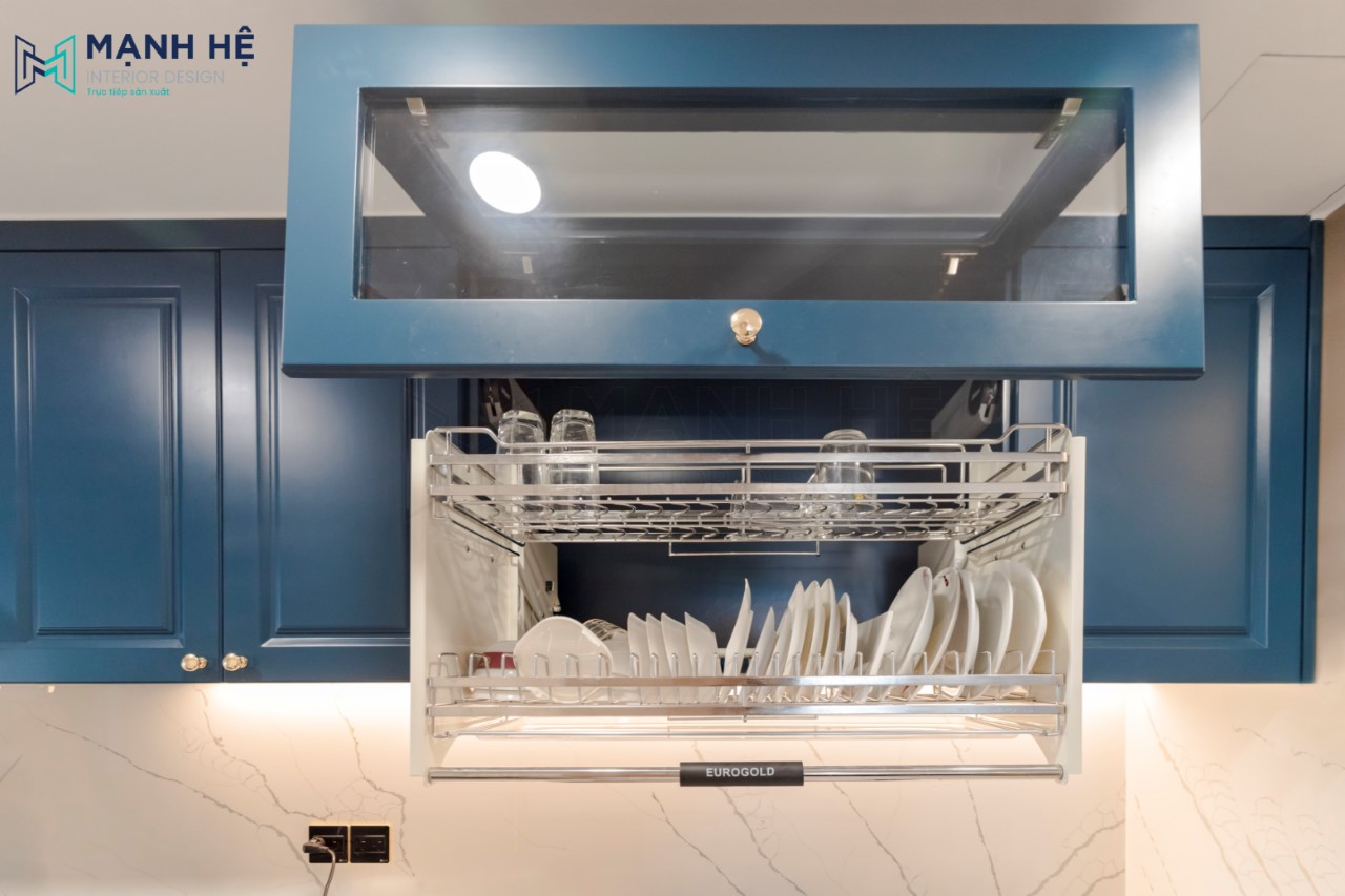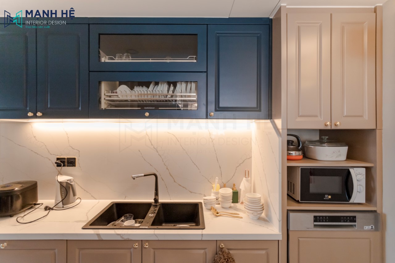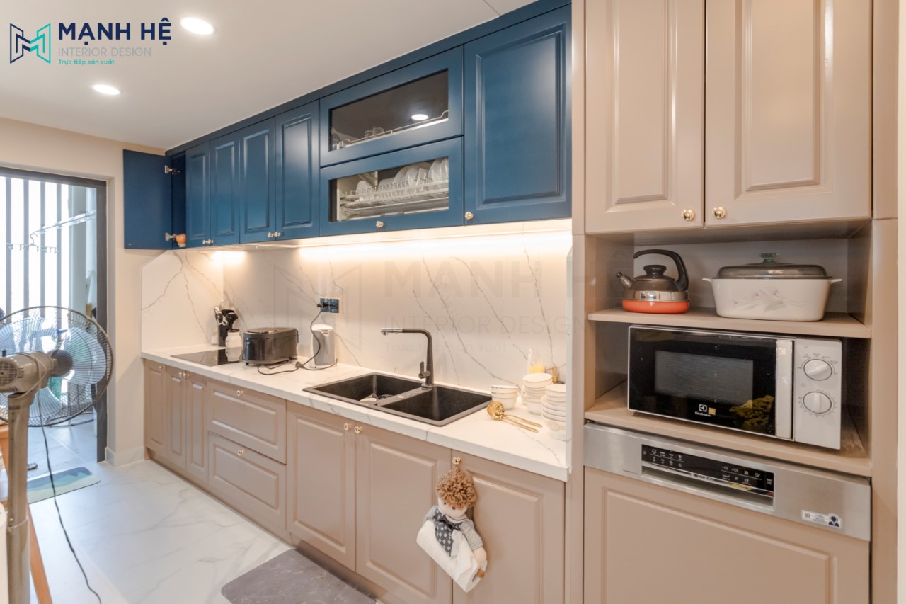 Hệ tủ bếp chữ I gỗ tự nhiên với sự đan xen hai màu xanh và trắng được tích hợp nhiều ngăn đa công năng, giúp gia chủ thuận tiện hơn trong việc nấu nướng cũng như lưu trữ đồ.