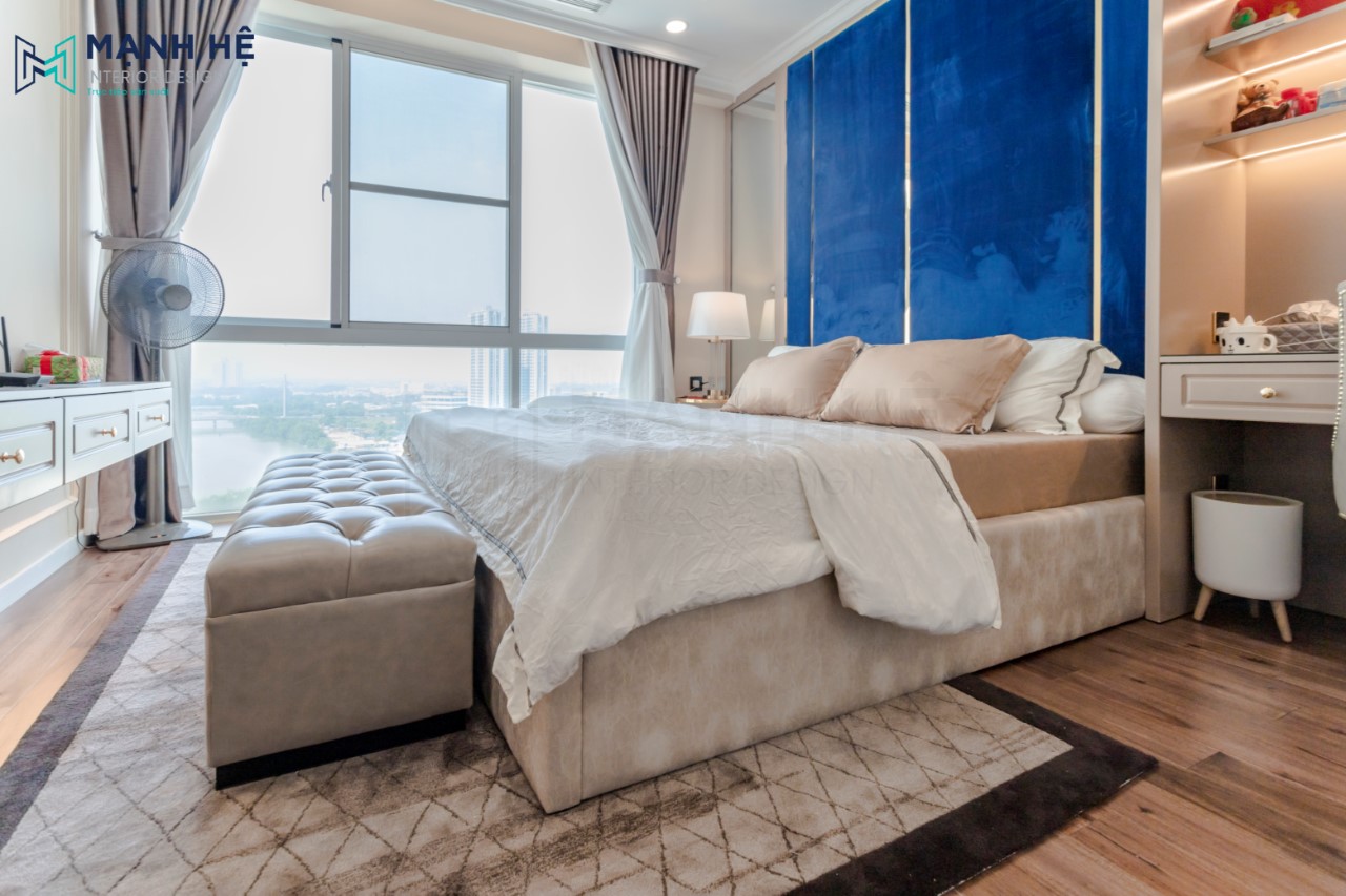 Vách ốp tường đầu giường màu xanh coban là điểm nhấn cho toàn bộ căn phòng. Bố trí giường ngủ với ghế sofa đặt phía cuối giường. Tối ưu ánh sáng căn phòng bằng rèm cửa. Lót sàn tạo cảm giác sạch sẽ, tinh tế.