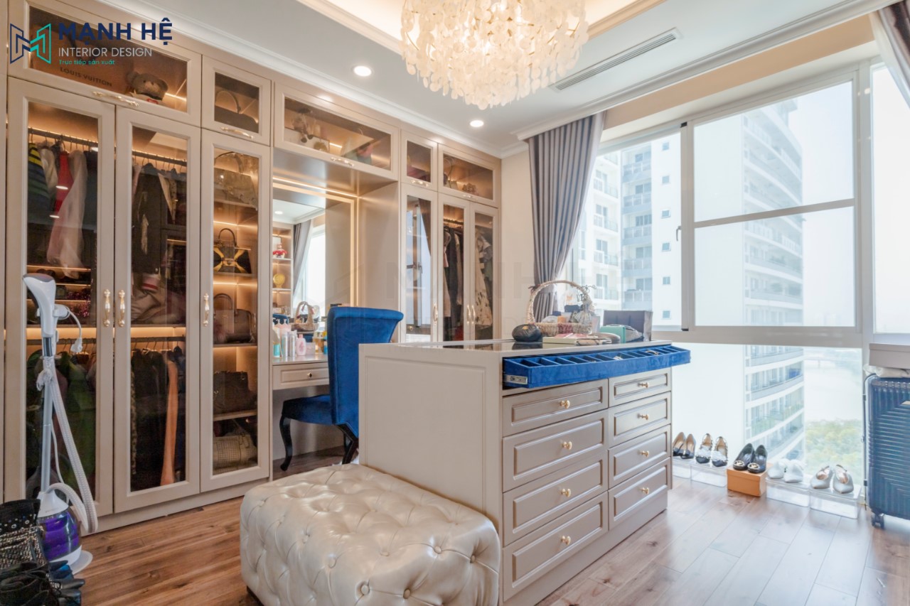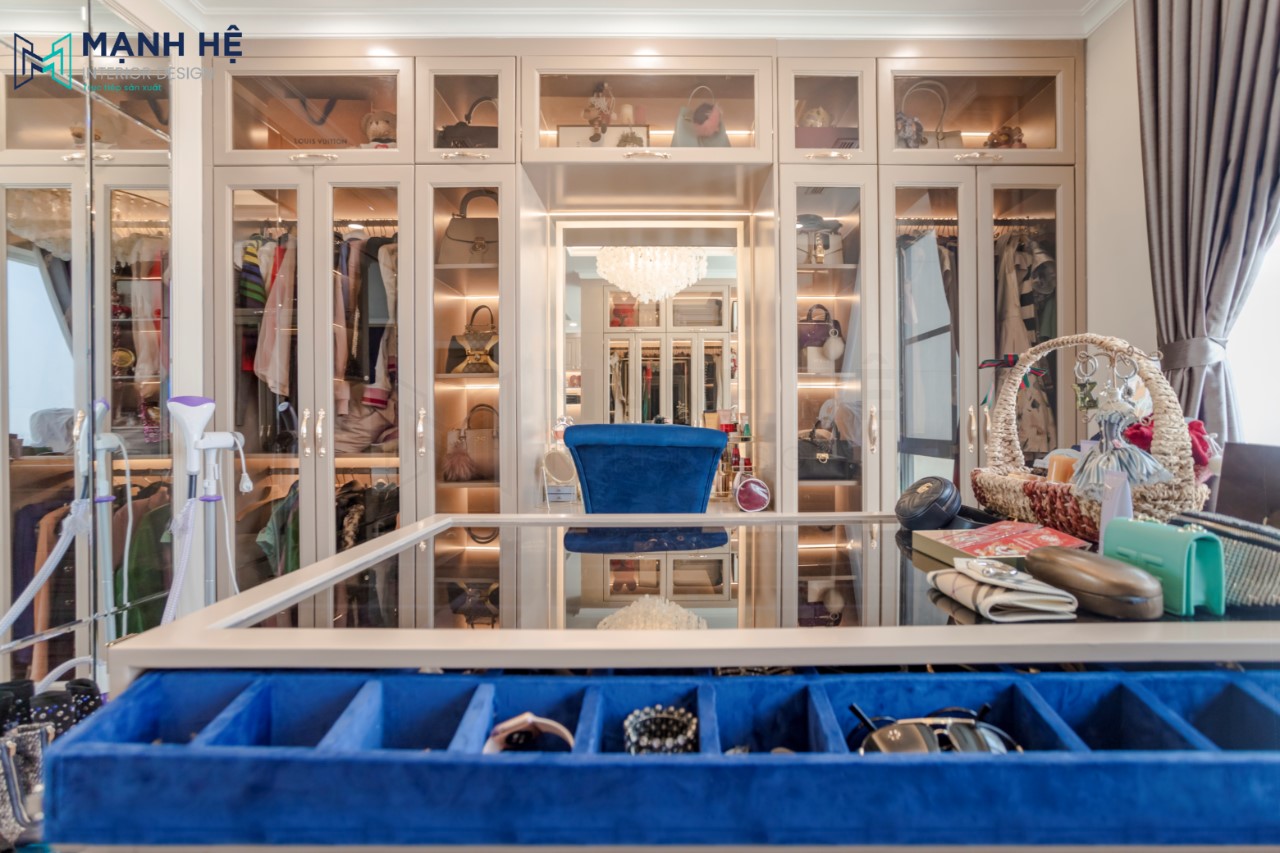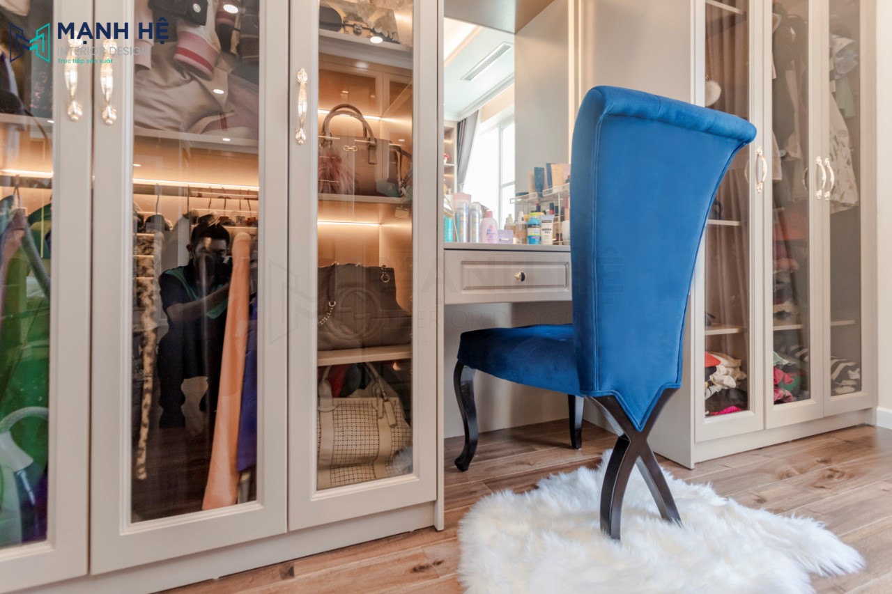Không gian phòng thay đồ được đặt phía sau vách tường, hoàn thiện phòng thay đồ bằng thiết kế tủ quần áo cửa kính kết hợp tủ đựng mỹ phẩm và túi xách. Tích hợp bàn trang điểm bên cạnh cho gia chủ nữ.