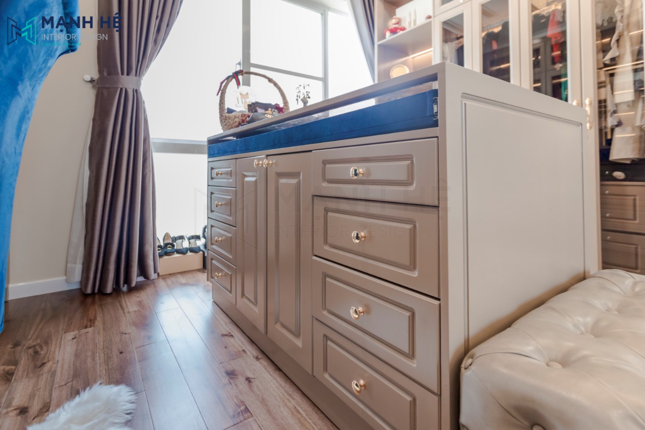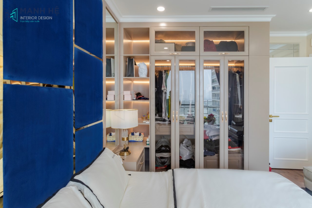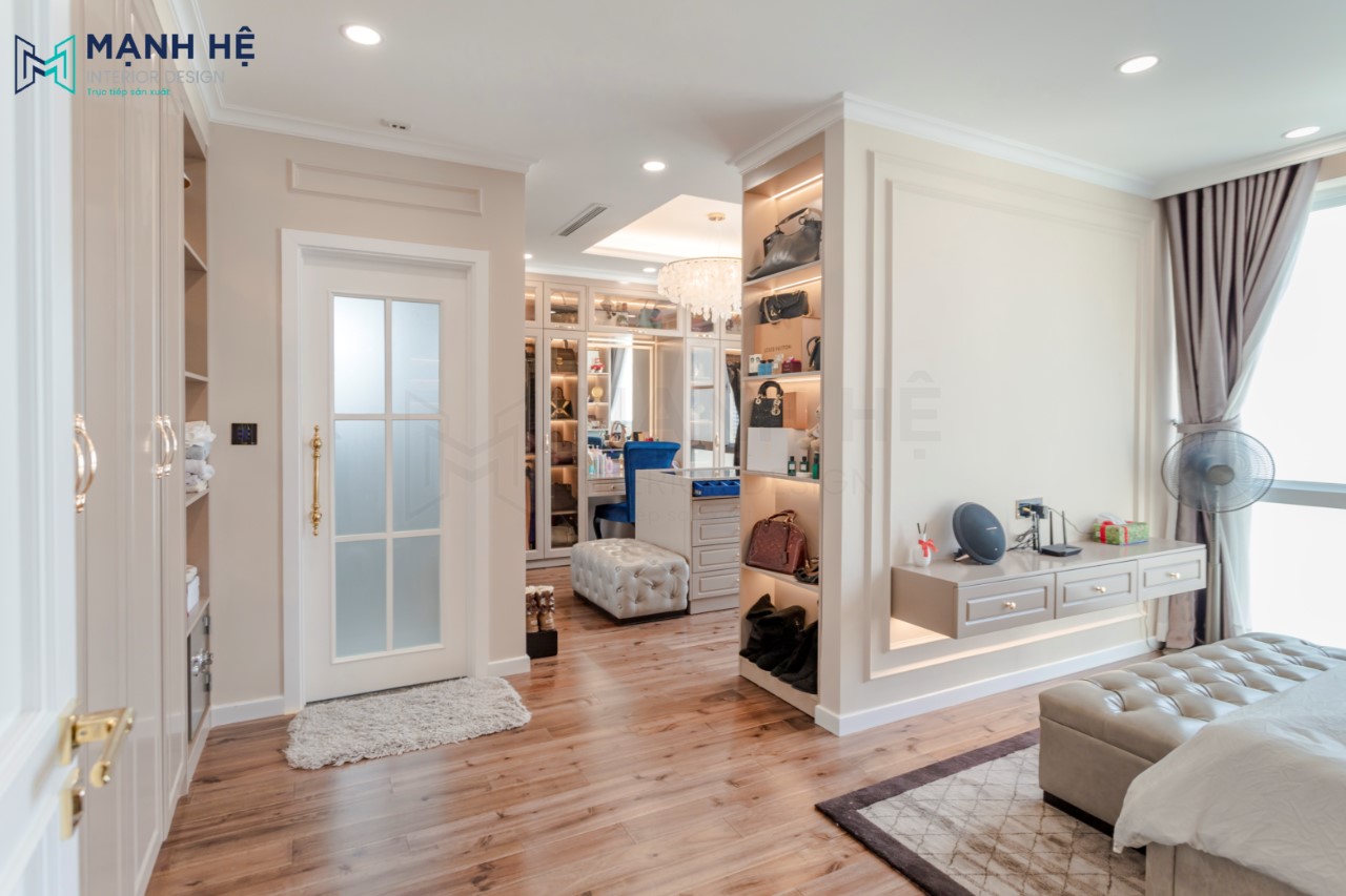 Không gian phòng thay đồ được đặt phía sau vách tường, hoàn thiện phòng thay đồ bằng thiết kế tủ quần áo cửa kính kết hợp tủ đựng mỹ phẩm và túi xách. Tích hợp bàn trang điểm bên cạnh cho gia chủ nữ.