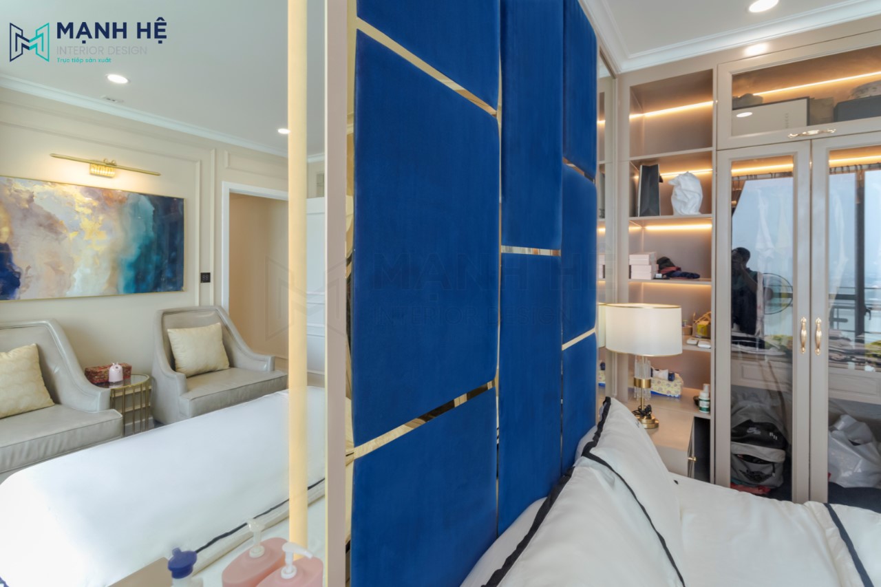 Thi công vách ốp đầu giường màu xanh coban làm điểm nhấn cho không gian