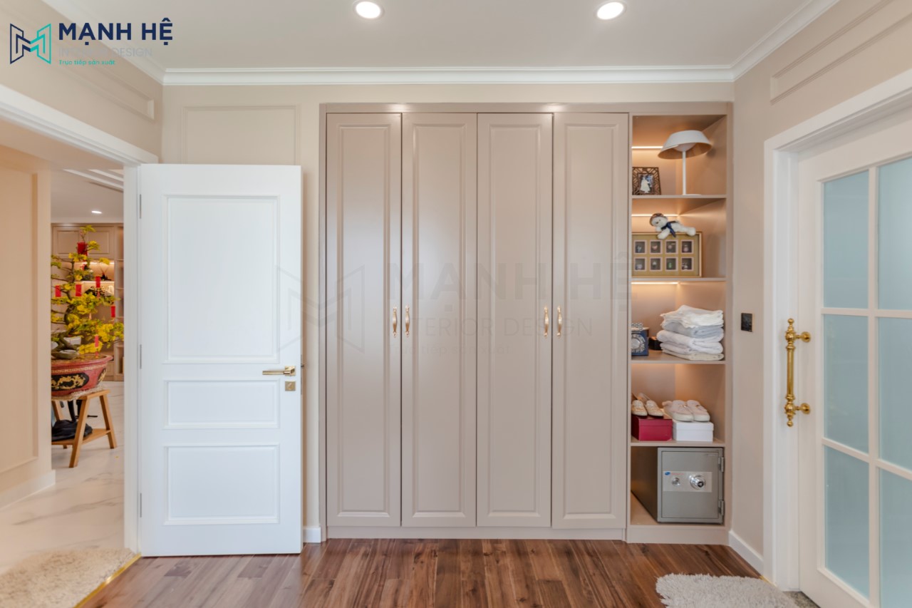 Hệ tủ âm tường bố trí ngay cửa ra vào phòng ngủ master