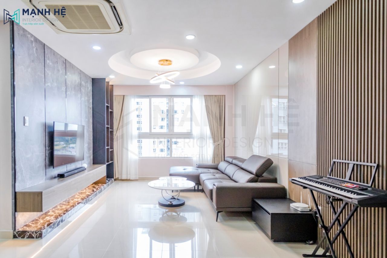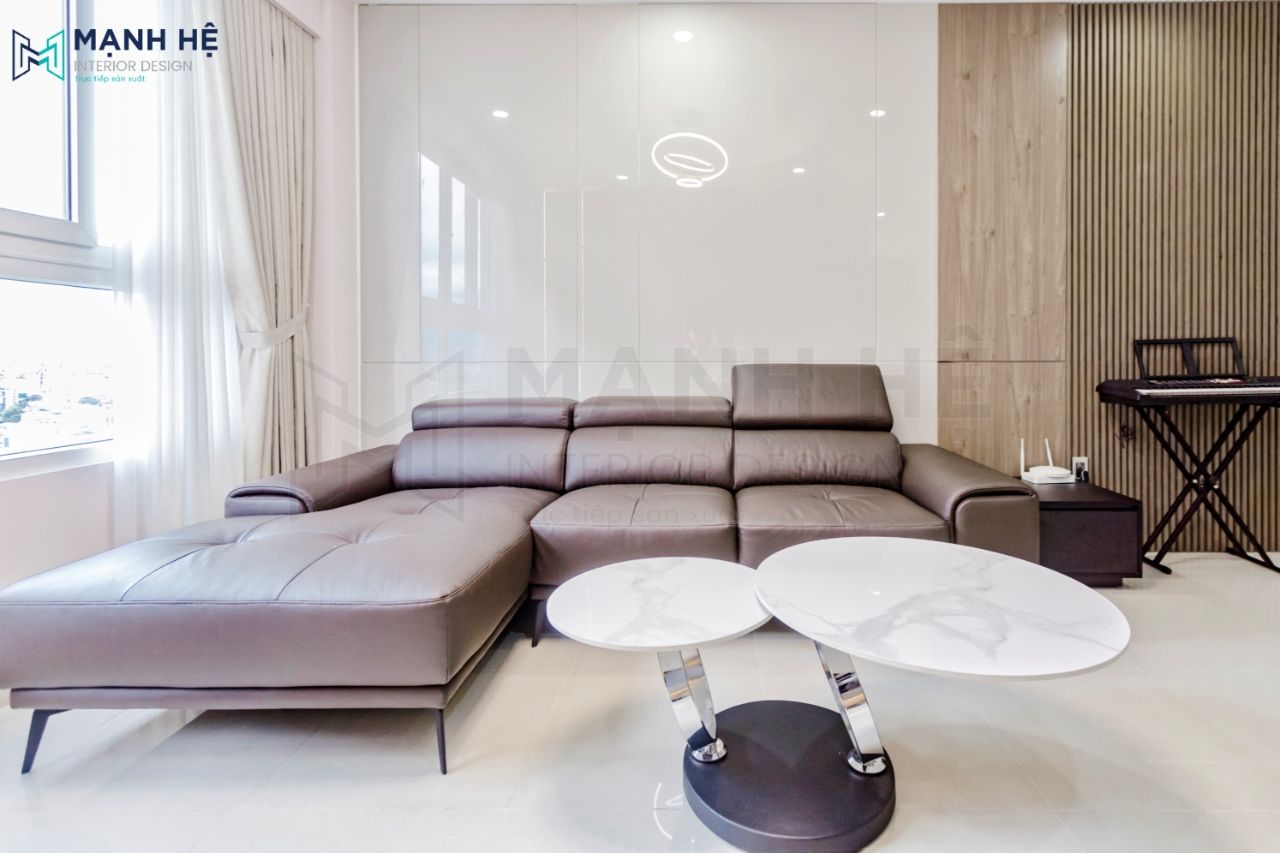Gia chủ lựa chọn gam màu trung tính trắng, ghi, be giúp tăng vẻ sang trọng cho phòng khách chung cư. Vách ốp tường phòng khách phủ acrylic sáng bóng, bắt mắt tạo điểm nhấn hiện đại cho căn hộ. Bộ sofa dạng chữ L được bọc da cao cấp với gam màu nhã nhặn.