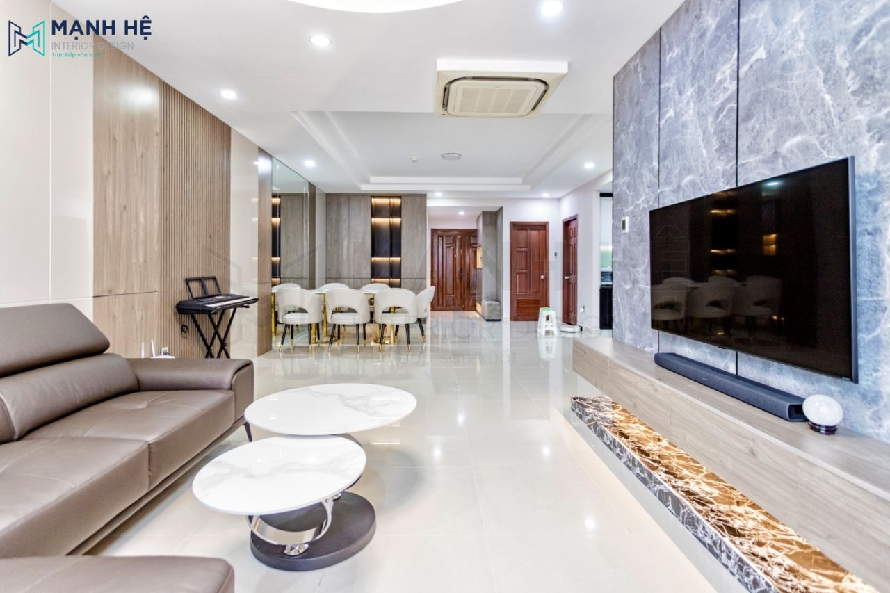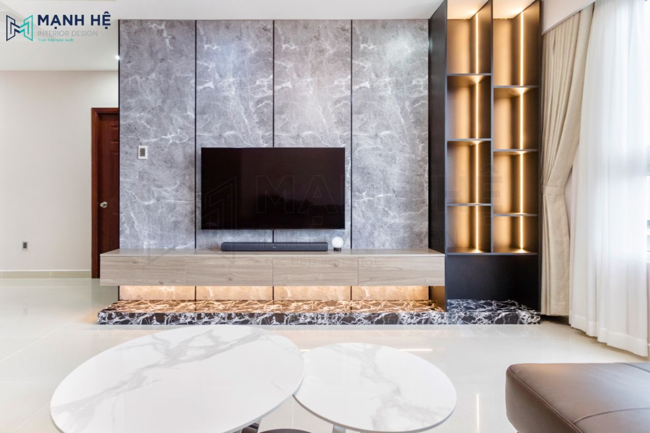 Thi công vách ốp tivi với gạch giả vân đá bắt mắt, tạo điểm nhấn nổi bật cho căn hộ. Bố trí kệ trang trí liền kề với tone màu đen kết hợp đèn led trang trí hiện đại, sang trọng.