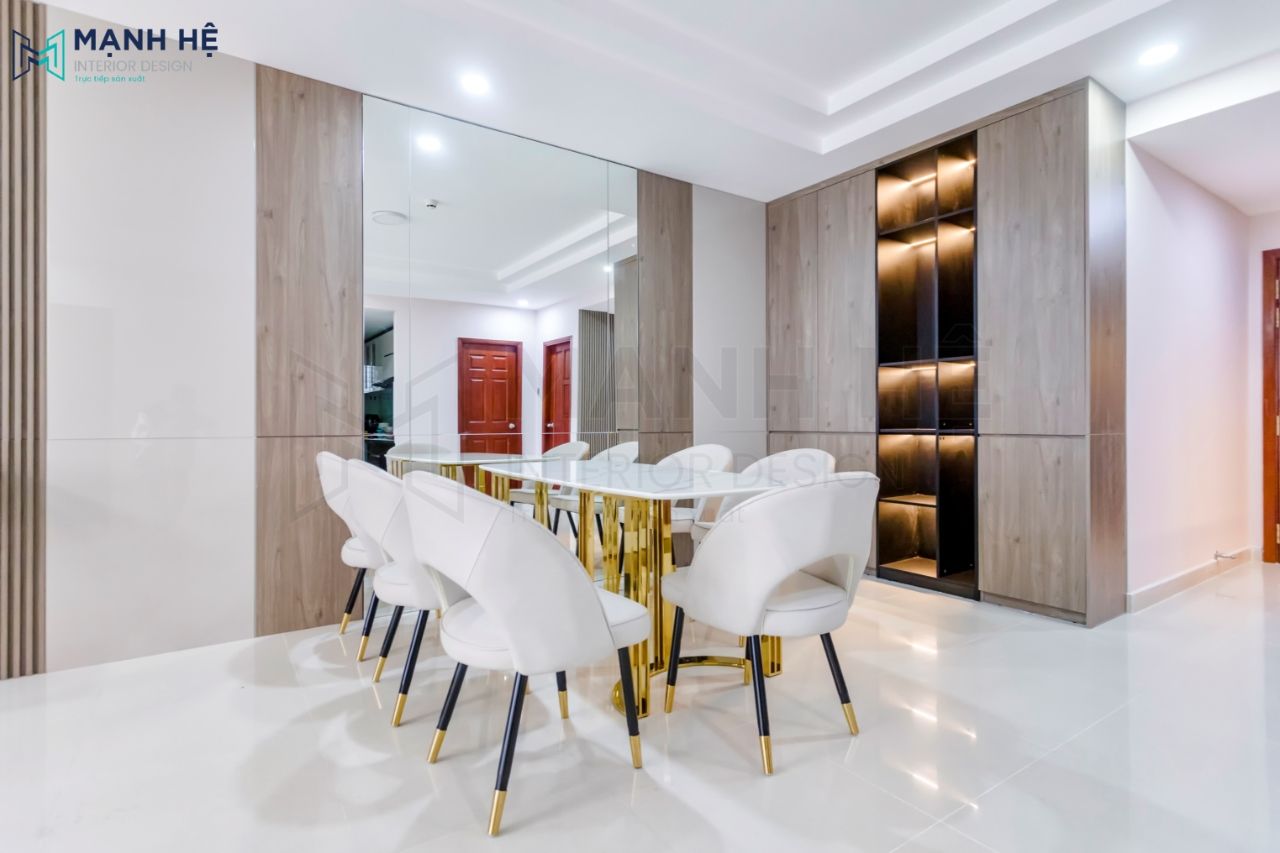 Bộ bàn ăn 5 người với gam màu trắng nền nã cùng màu vàng đồng sang trọng, cao cấp. Vách ốp kính tăng thêm vẻ đẹp thẩm mỹ cho bàn ăn, tạo không gian ấm cúng cho gia đình dùng bữa.