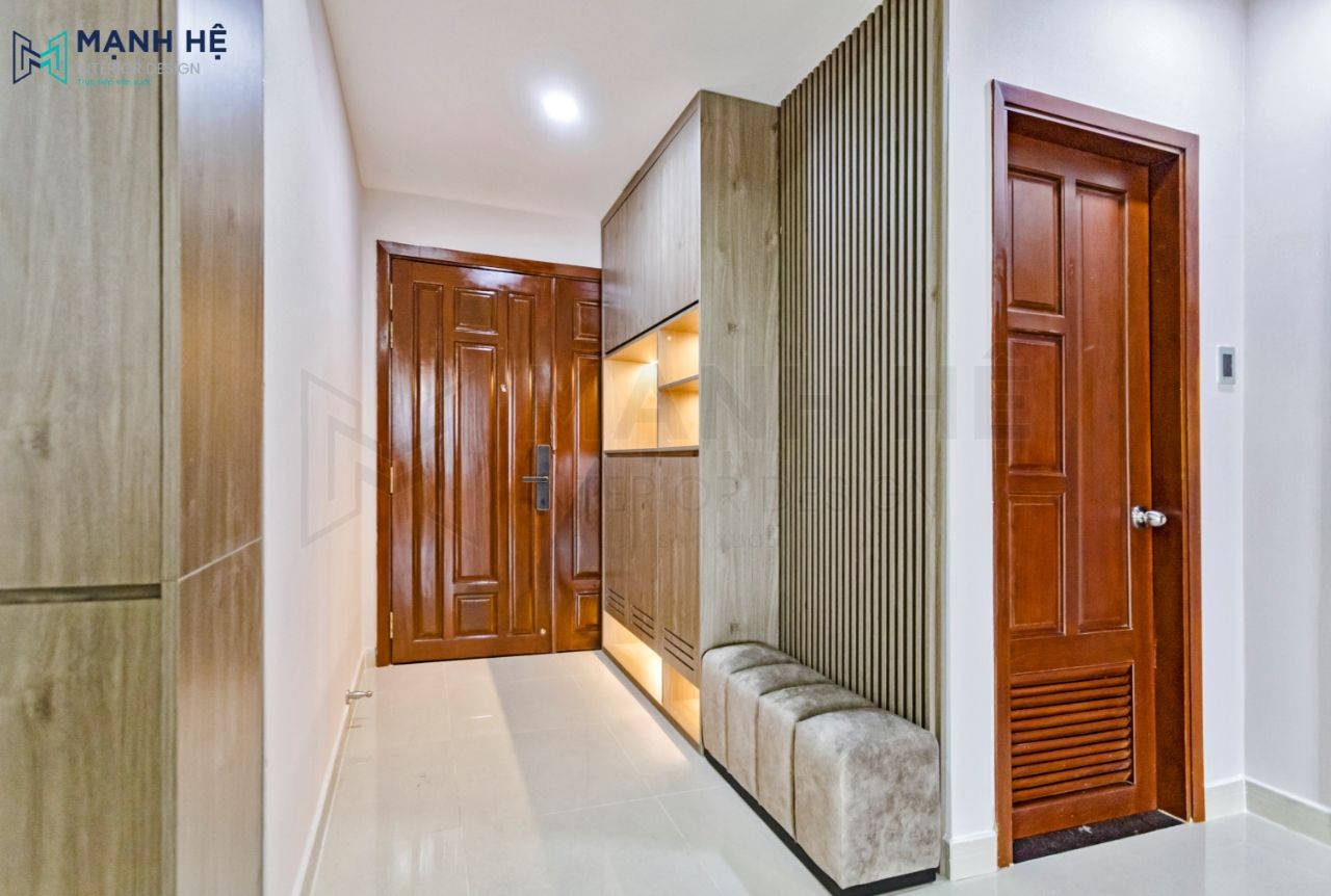 Bố trí tủ giày cao kịch trần với chất liệu gỗ công nghiệp kết hợp đèn led trang trí hiện đại. Tôn thêm vẻ thẩm mỹ với thiết kế lam gỗ nhựa cùng ghế đôn thay giày được bọc vải cao cấp, tinh tế.