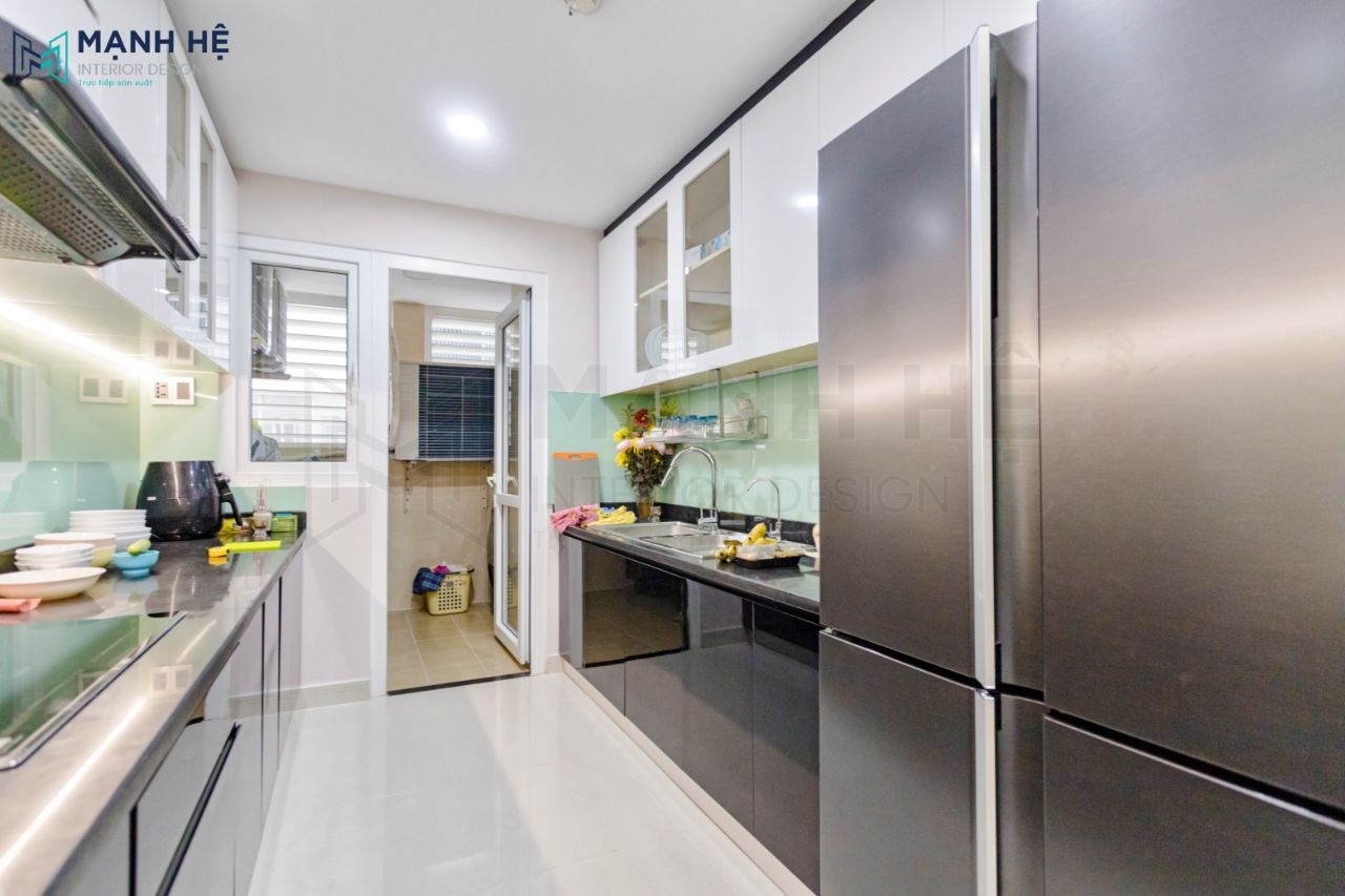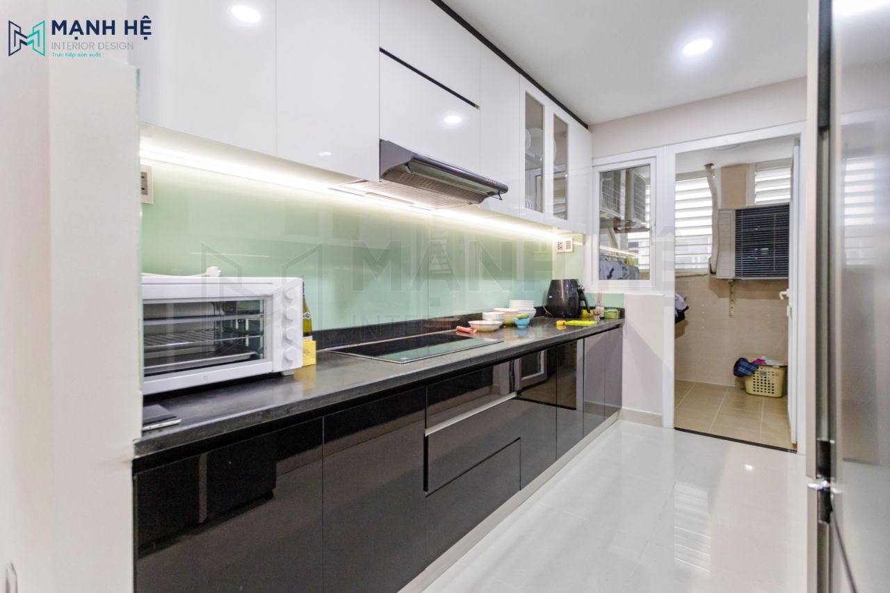 Hệ tủ bếp bằng gỗ công nghiệp phủ acrylic với gam màu trắng, đen lịch lãm, sang trọng. Vách ốp bếp sáng bóng, sạch sẽ, giúp gia chủ dễ dàng lau chùi kết hợp với đèn led trang trí hiện đại.