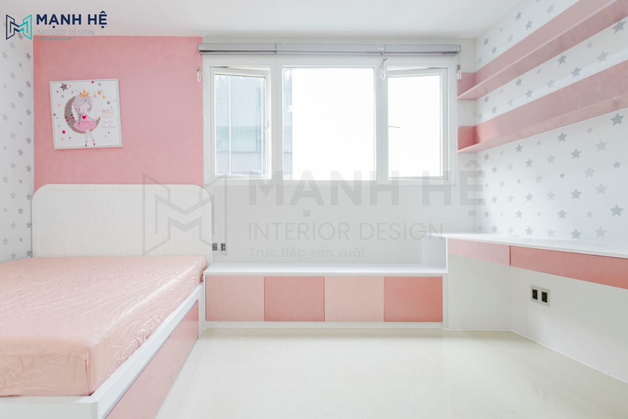 Phòng ngủ bé gái được hoàn thiện với với gam màu trắng, hồng nhẹ nhàng, dễ thương. Nội thất phòng ngủ bằng gỗ công nghiệp hiện đại, tươi mới, năng động. Cửa sổ lớn với thiết kế rèm cuốn tối ưu ánh sáng tự nhiên, thoáng mát cho phòng ngủ.
