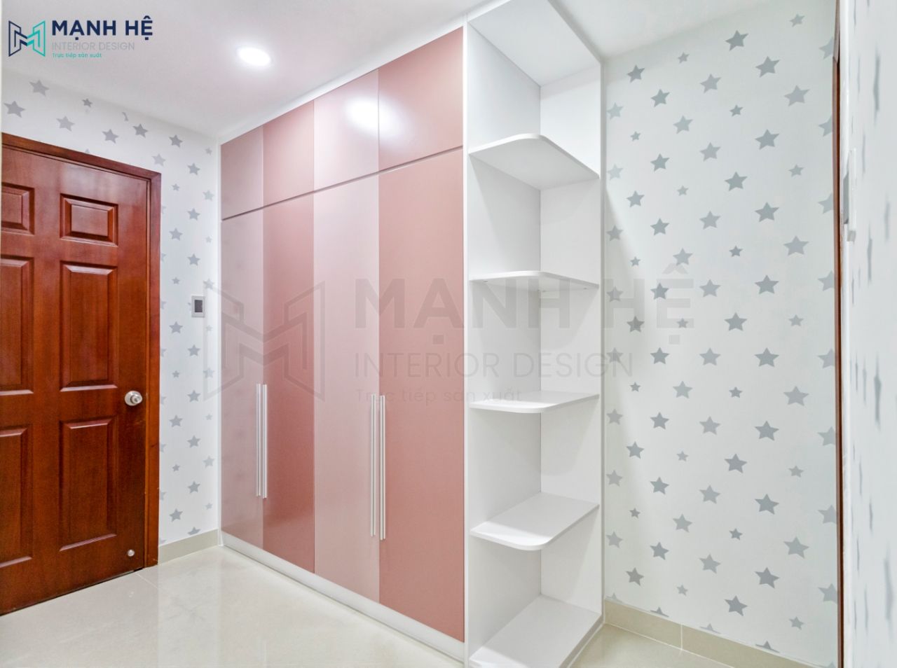 Tủ quần áo cao kịch trần 4 cánh mở với gam màu trắng, hồng xen kẽ đẹp mắt. Đồng thời tích hợp kệ trang trí tiện nghi, gia chủ có thể decor những món đồ yêu thích theo sở thích của mình.