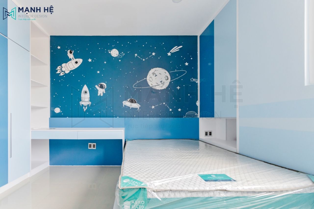 Bố trí giấy dán tường đầu giường với họa tiết vũ trụ thích hợp với bé trai năng động, hài hòa với màu sắc căn phòng. Nội thất trong căn phòng bố trí phù hợp với không gian diện tích khiêm tốn, nhưng mang lại không gian thoáng đãng, thoải mái.
