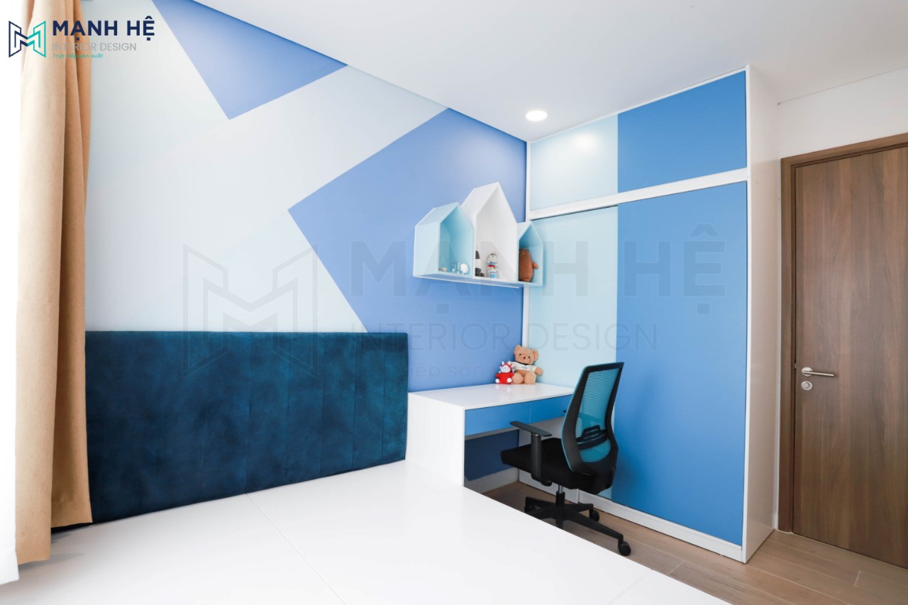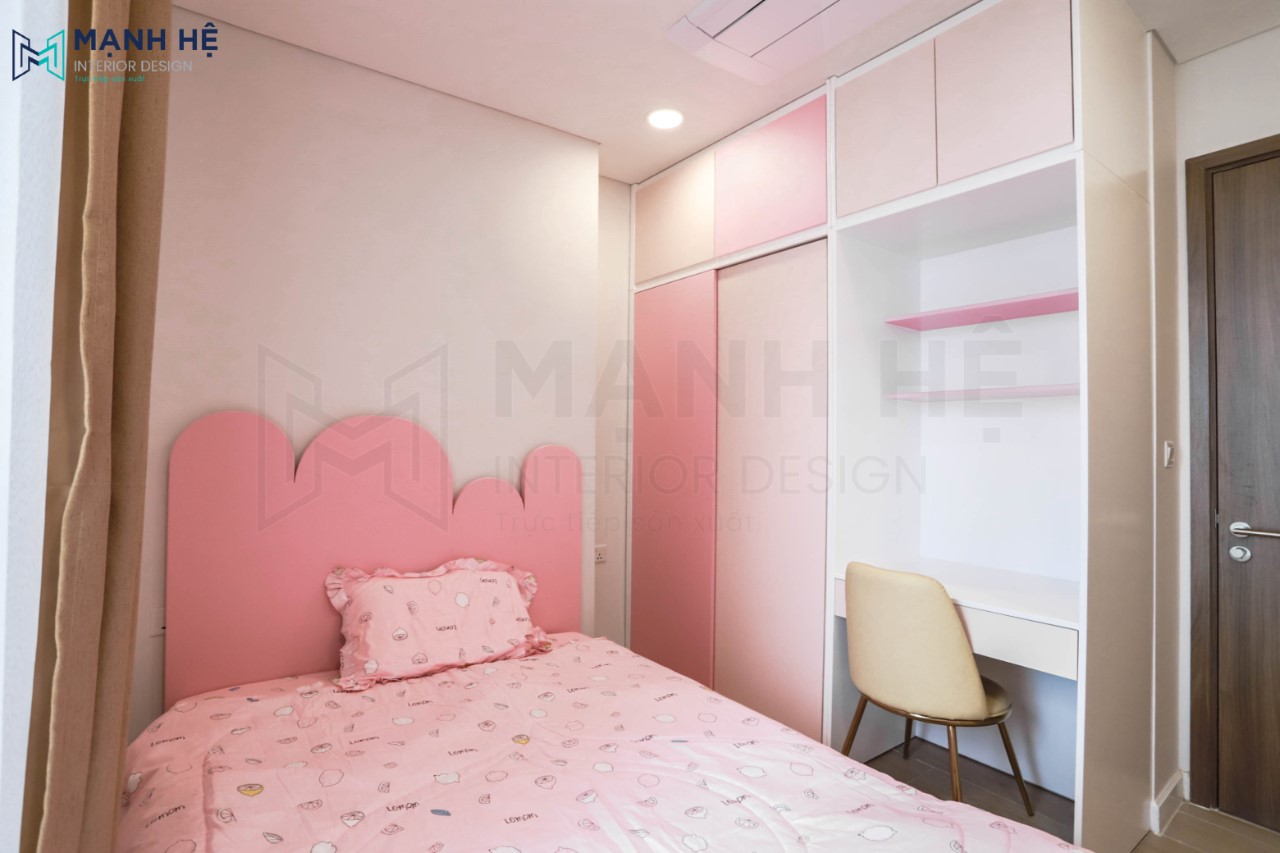Tổng thể không gian nội thất 3 phòng ngủ được tận dụng tối đa diện tích với những chi tiết nội thất được sản xuất có kích thước chuẩn xác với bố cục riêng của từng vị trí. Đặc biệt, đối với phòng ngủ của hai bé nhỏ mang màu sắc cực kỳ sinh động, màu sơn lên thực tế chuẩn với bản vẽ thiết kế.
