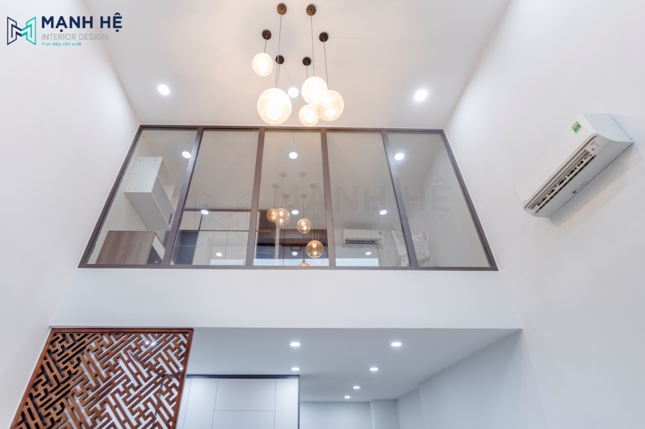 Hệ thống đèn trần thả với thiết kế mới lạ đem lại ánh sáng cho phòng khách. Sử dụng cánh kính cho gác lửng thêm sang trọng.