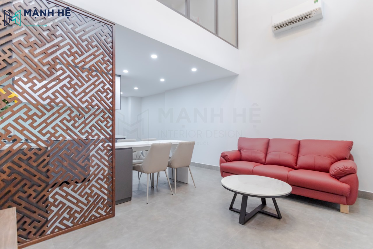 Thi công hoàn thiện nội thất nhà phố có gác lửng đơn giản mà tiện nghi với điểm nhấn bộ ghế sofa đệm màu đỏ nổi bật, thêm bàn trà tròn nhỏ phía trước. Sự đặc biệt đến từ gác lửng nhỏ được tận dụng làm phòng ngủ cho gia chủ.
