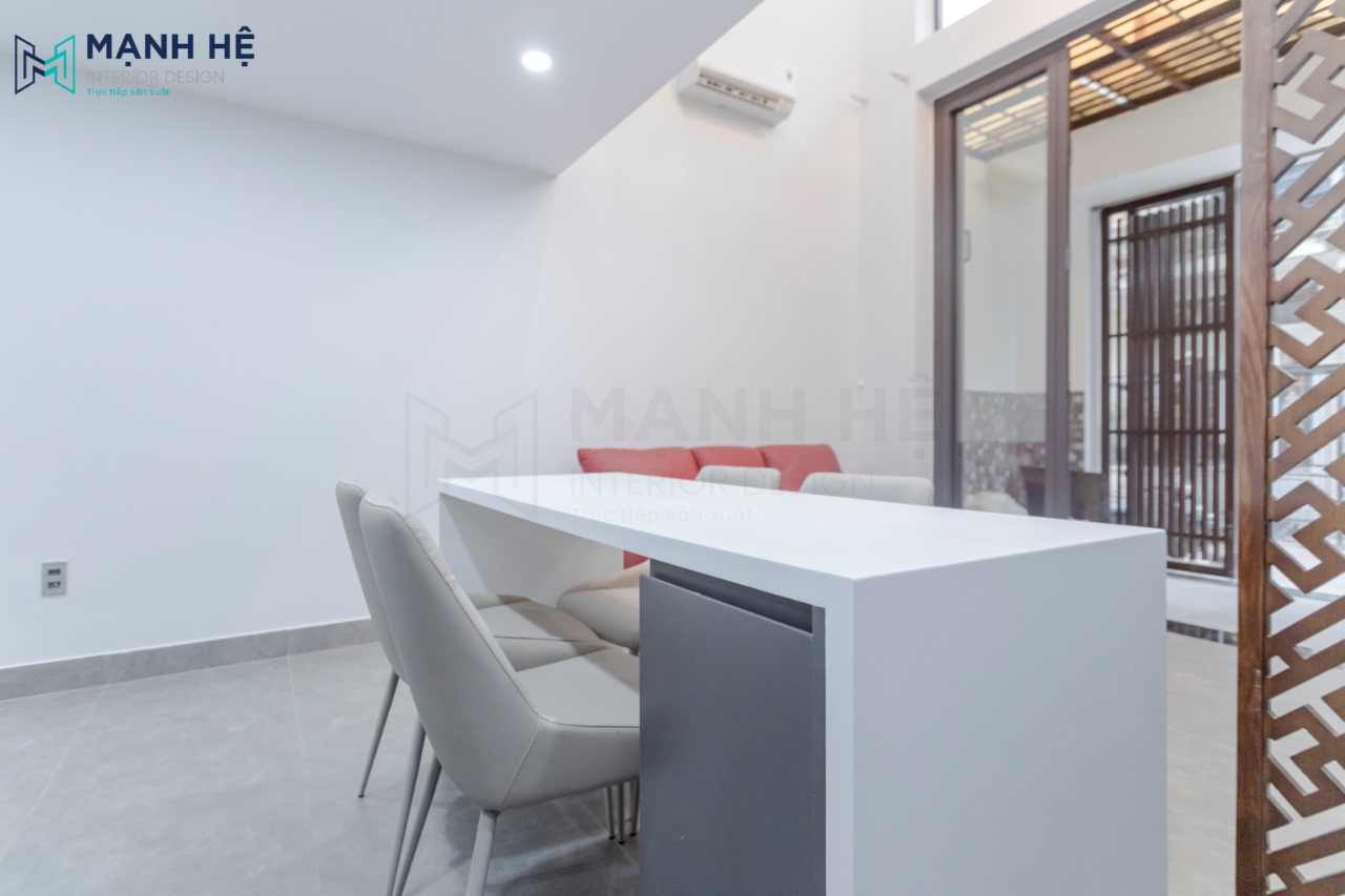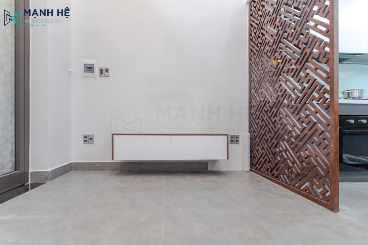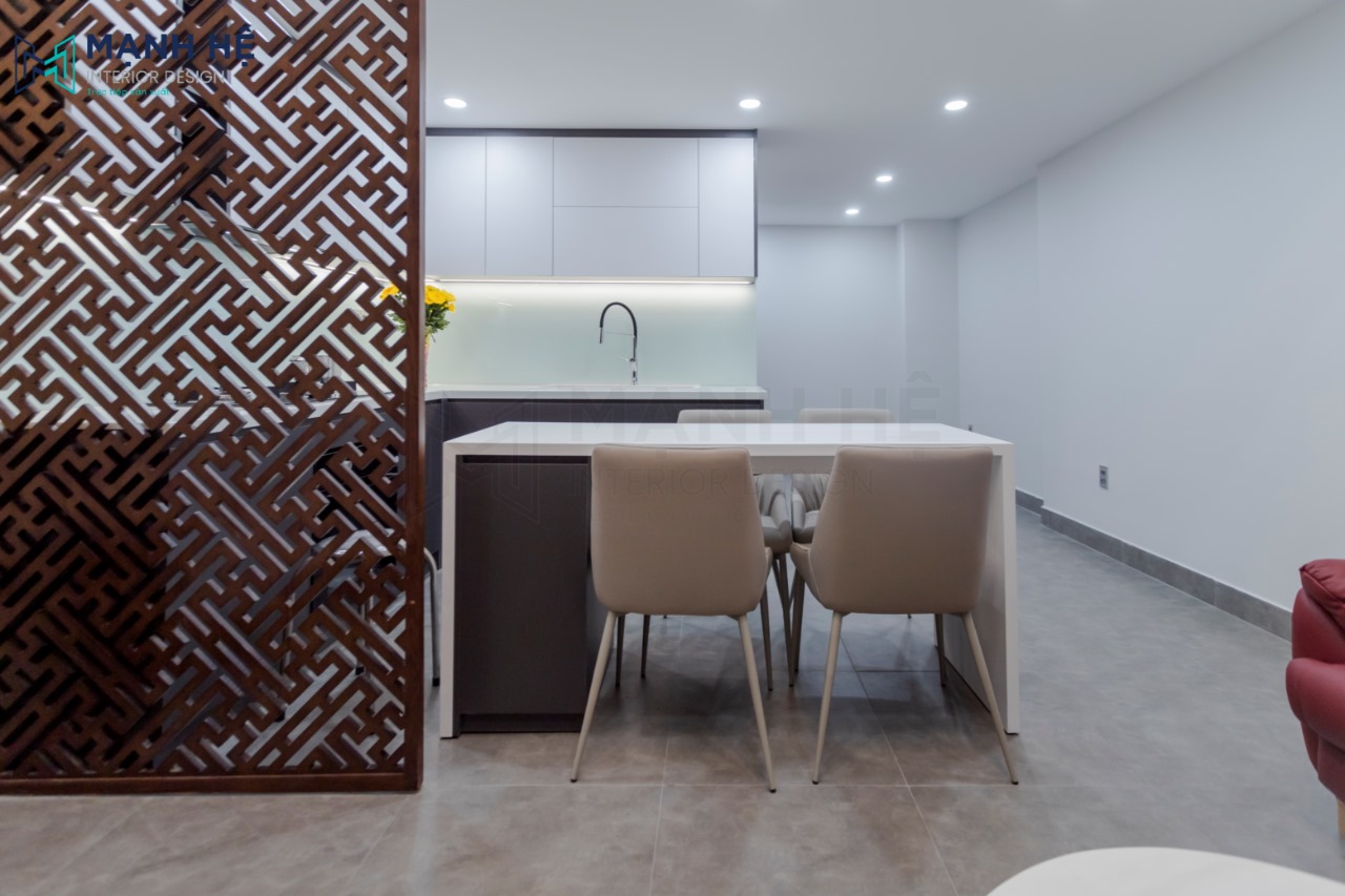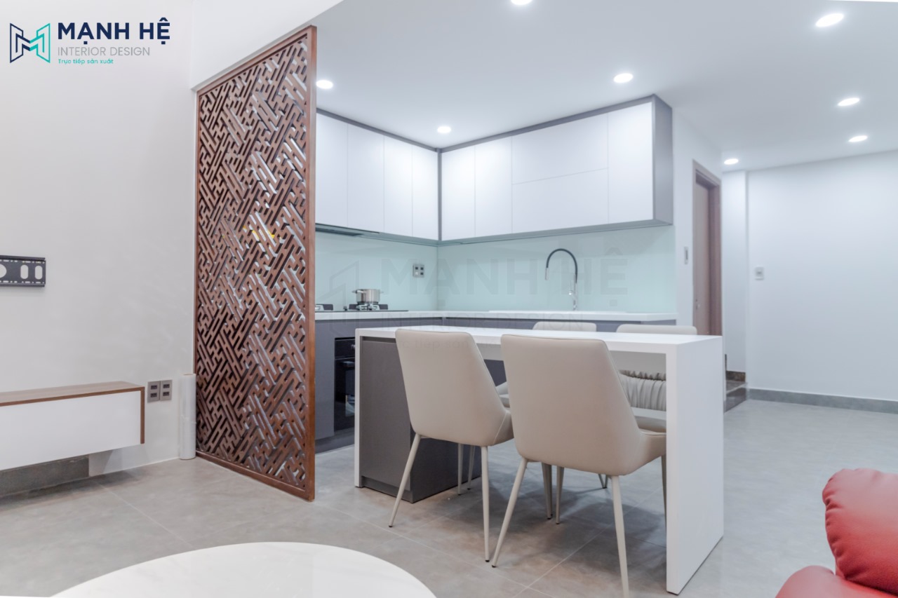 Không gian phòng bếp ngăn cách phòng khách bởi bộ bàn ăn và vách ngăn CNC