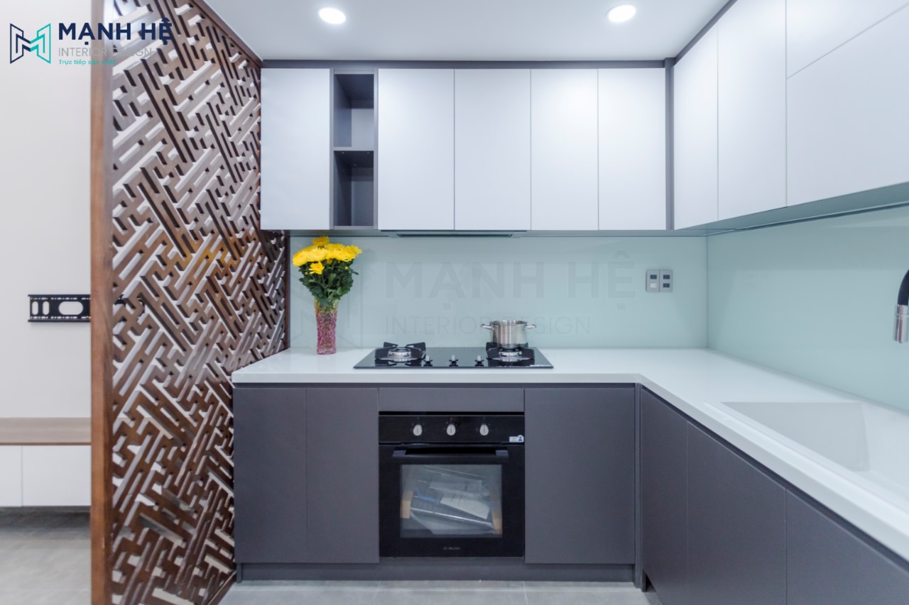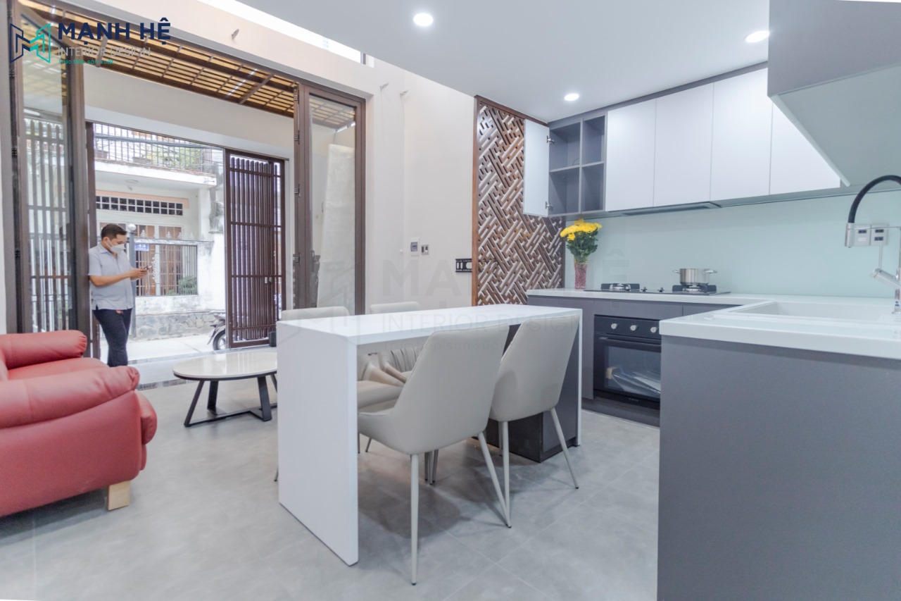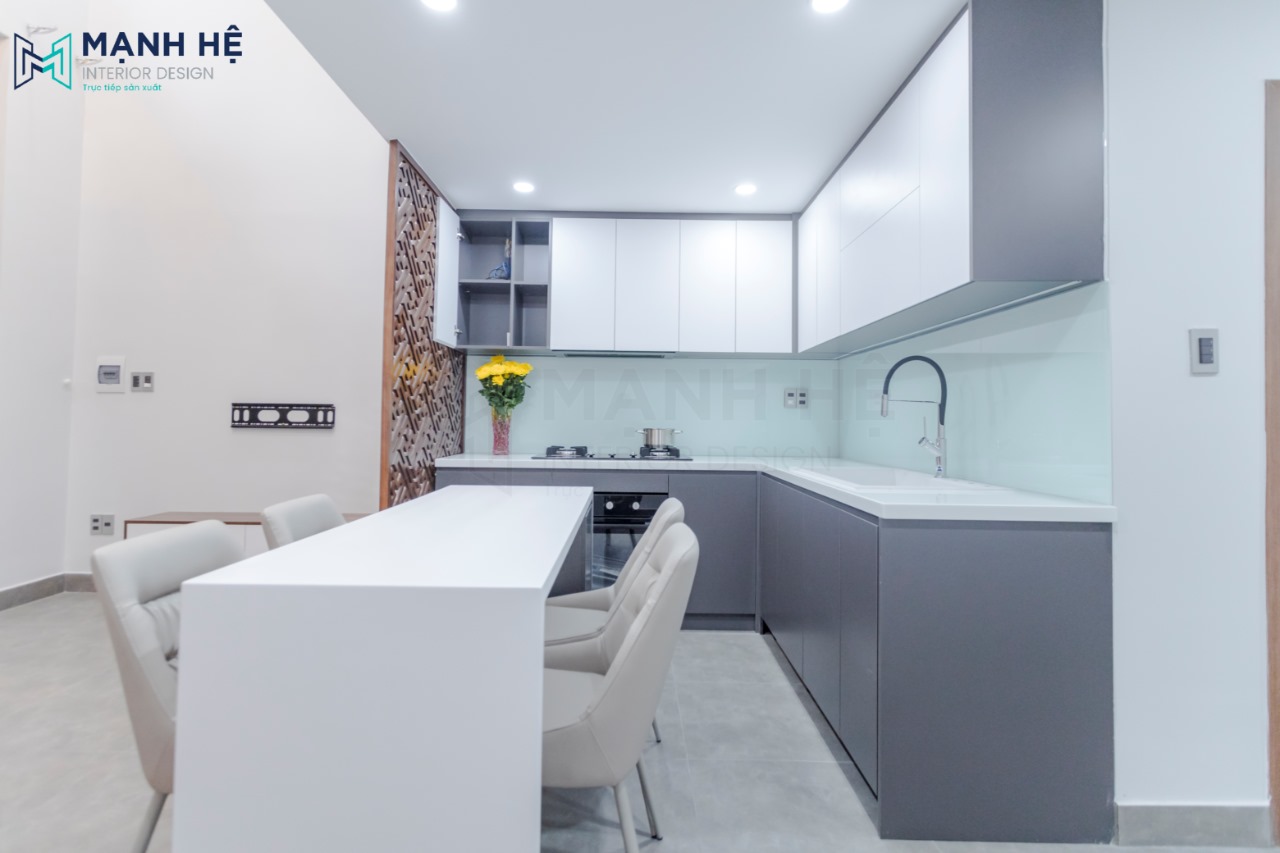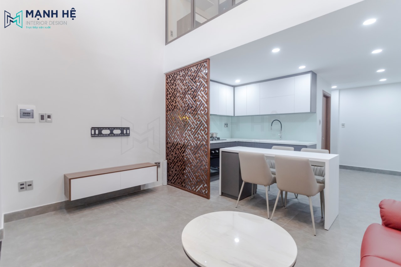 Không gian phòng bếp ngăn cách phòng khách bởi bộ bàn ăn và vách ngăn CNC