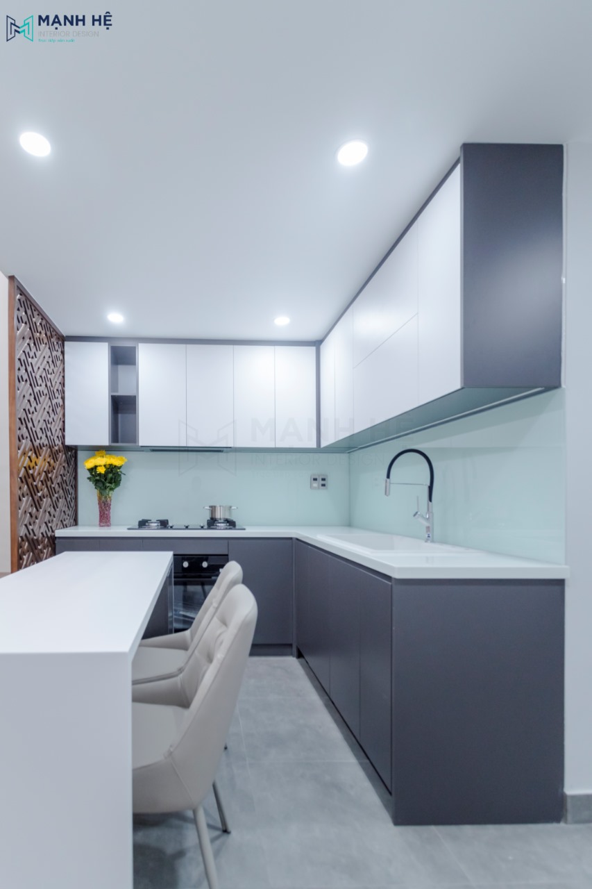 Vách ngăn VNC giúp phân biệt phòng khách và phòng bếp màu nâu. Thiết kế phòng bếp với nội thất gỗ công nghiệp phủ melamine. Hệ tủ bếp chữ L cao đụng trần với gam màu trắng nền nã.